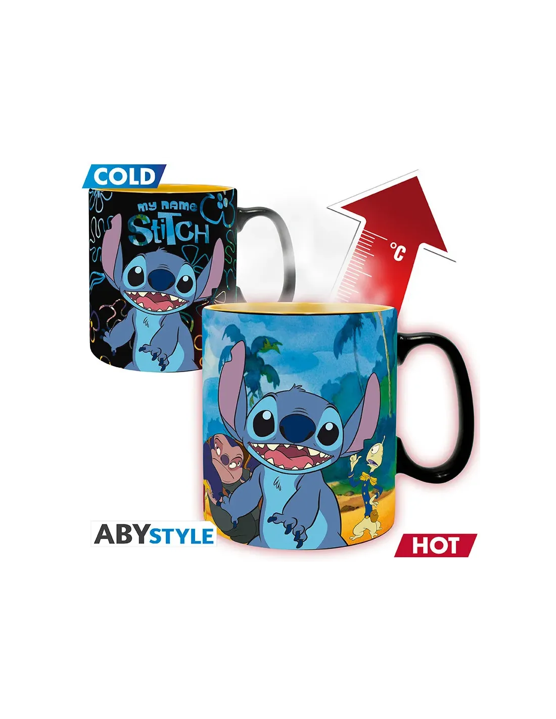 Características de la Taza Térmica DISNEY Lilo & Stitch King Size (460 ml)Disfruta tu café o infusión favorita con un toque de magia y nostalgia gracias a esta **taza térmica de Lilo & Stitch de DISNEY**, diseñada para sorprender con cada uso. Con un formato **King Size de 460 ml**, esta taza es ideal para los verdaderos amantes del café que también son fans del universo Disney. Su acabado térmico revela un diseño oculto cuando se vierte líquido caliente, haciendo que cada bebida sea una pequeña experiencia visual.Diseño que cambia con el calorUna taza que no solo cumple su función, sino que **cobra vida con el calor**. Al verter líquido caliente, el diseño revela a tus personajes favoritos de Lilo & Stitch, convirtiendo cada bebida en un momento especial.Diseño térmico con efecto sorpresaPersonajes de Lilo & Stitch visibles con bebidas calientesInspirada en la icónica frase: "Ohana significa familia"Gran capacidad y diseño exclusivoPensada para quienes disfrutan de tazas grandes, esta versión King Size permite servir más cantidad sin renunciar al diseño ni a la calidad. Su estructura de cerámica ofrece una buena retención de temperatura y un tacto agradable.Capacidad de 460 mlFabricada en cerámica resistenteDiseño oficial con licencia DISNEYRecomendaciones de usoPara conservar el efecto térmico y los colores del diseño, es importante seguir las instrucciones de cuidado. Este producto **no es apto para microondas ni lavavajillas**.Lavado a mano recomendadoNo usar en microondasNo introducir en lavavajillasOtras especificacionesMarca: ABYstyleLicencia oficial DISNEYTipo: Taza térmica con cambio de color