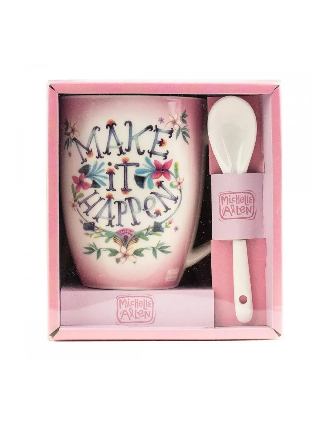 Características de la Taza con Cuchara Enesco Make It HappenLa **taza con cuchara Enesco Make It Happen** es el complemento perfecto para quienes buscan comenzar el día con estilo y una dosis de motivación. Diseñada con un toque artístico y fabricada por una marca reconocida por su calidad, esta taza es ideal tanto para uso personal como para regalar en ocasiones especiales.Diseño inspirador y acabado decorativoEsta taza destaca por su diseño floral en tonos vivos y el mensaje central **"Make it Happen"**, que invita a afrontar el día con energía positiva. El contraste entre el fondo blanco y los detalles coloridos aporta un estilo moderno y atractivo, ideal para alegrar cualquier escritorio o cocina.Diseño con mensaje motivacional "Make it Happen"Decoración floral en colores vivosFondo blanco que resalta los detallesIncluye cuchara de cerámica a juegoLa taza viene acompañada de una **cuchara de cerámica blanca**, pensada para remover fácilmente tu bebida favorita: café, té o infusiones. Un conjunto práctico y funcional para el uso diario.Cuchara de cerámica incluidaMaterial resistente y fácil de limpiarDiseño coordinado con la tazaProducto oficial con garantía de autenticidadFabricada por **Enesco**, una marca reconocida internacionalmente por sus diseños creativos y productos licenciados, esta taza cuenta con **licencia oficial**, lo que garantiza su autenticidad y exclusividad. Ideal para quienes valoran los detalles con significado.Fabricante: EnescoProducto con licencia oficialPerfecto como regalo original o coleccionableOtras especificacionesTipo de producto: Taza con cucharaUso recomendado: Bebidas calientesMaterial principal: CerámicaMotivo: Frase inspiradora + decoración floral