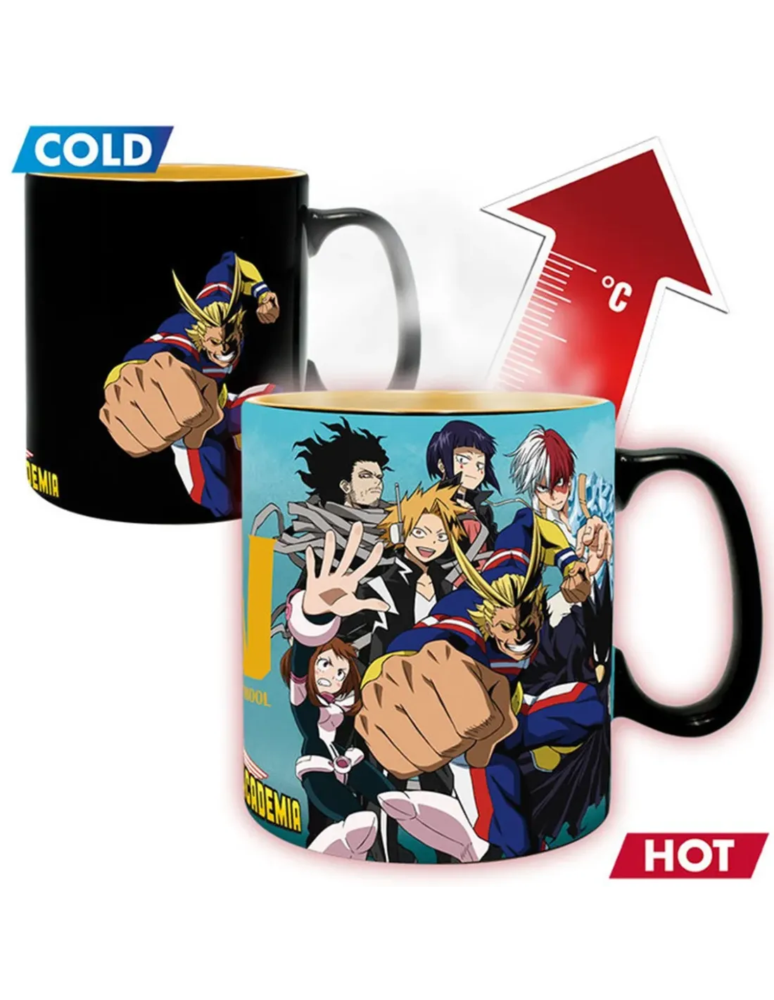 Esta taza térmica mostrará a varios de los estudiantes de la UAcon All Might en cuanto se vierta liquido caliente en ella. Un grandiseño para quienes sigan la serie de animación japonesa que loesta "petando" en Netflix, MY HERO ACADEMIA.Datos técnicosALTURA 11 CMANCHO 10 CMCOLOR NEGROLONGITUD 13 CMMATERIAL CERAMICAPESO 550 GR