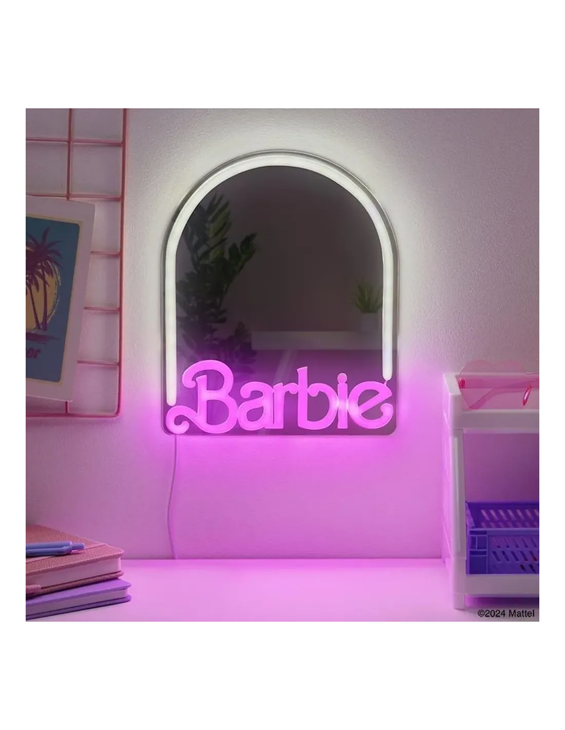 Características del Espejo LED Neon Barbie Wall MountableEl **espejo decorativo con luz LED Neon de Barbie** es la combinación perfecta entre estilo y funcionalidad. Diseñado para aportar un toque vibrante y moderno a cualquier estancia, este accesorio oficial de Barbie es ideal para dormitorios juveniles, tocadores o espacios creativos. Su montaje en pared es sencillo gracias a las tiras adhesivas incluidas, y su alimentación por USB facilita la instalación sin necesidad de baterías.Diseño decorativo con luz LED NeonEl espejo incorpora un **logo Barbie en luz LED de color rosa neón**, situado en la parte inferior, que añade un efecto visual moderno y elegante. Su acabado tipo espejo permite su uso práctico al tiempo que decora.Altura total: 27 cm (10,6")Diseño decorativo con respaldo de espejoIluminación LED en color rosa estilo neónFácil instalación y alimentación por USBPensado para colocarlo sin complicaciones, incluye **tiras adhesivas de montaje en pared**, lo que permite fijarlo de forma segura en distintas superficies. El sistema de alimentación por USB con cable de 1,5 metros aporta versatilidad y comodidad.Incluye tiras adhesivas para montaje en paredCable USB integrado de 1,5 m de longitudNo requiere baterías externasProducto oficial con licencia BarbieEste espejo LED es un **producto con licencia oficial de Barbie**, garantizando diseño exclusivo y acabados de calidad. Un complemento original para fans de la marca o quienes buscan decorar con estilo propio.Producto con licencia oficialAporta un toque de color y personalidad a la estanciaApto para espacios juveniles o temáticos