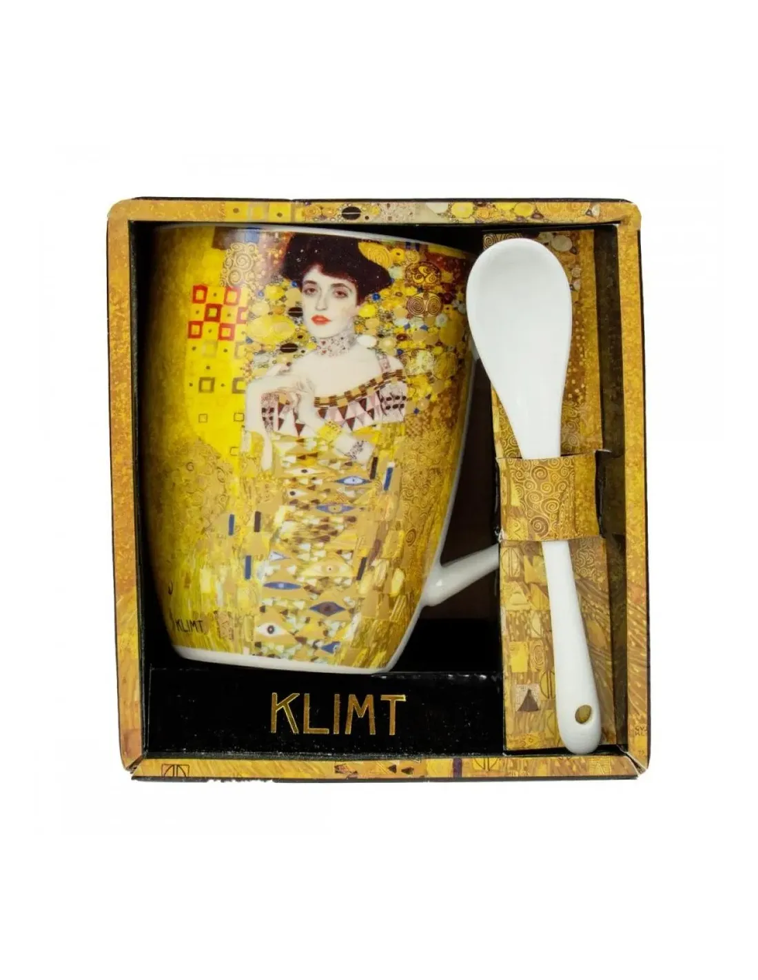 Características de la Taza con cuchara Enesco El Retrato de Adele Gustav KlimtLa taza con cuchara Enesco inspirada en "El retrato de Adele" de Gustav Klimt es una pieza que combina funcionalidad y arte en un solo producto. Ideal para amantes del arte y del diseño, esta taza aporta un toque elegante y distintivo a cualquier momento del día, ya sea para café, té o infusiones.Diseño artístico inspirado en KlimtEsta taza destaca por su acabado decorativo basado en una de las obras más icónicas de Gustav Klimt, con tonos dorados y detalles ornamentales que evocan el estilo modernista del artista. Es perfecta tanto para uso diario como para coleccionistas.Diseño inspirado en "El retrato de Adele"Estilo artístico con predominio de tonos doradosProducto oficial de EnescoIncluye cuchara a juegoEl set incorpora una cuchara de diseño coordinado, que se integra perfectamente con la taza gracias a su soporte lateral. Una solución práctica y estética para remover tus bebidas con comodidad.Cuchara incluida en color blancoSoporte integrado en la tazaConjunto funcional y decorativoPresentación ideal para regaloSe presenta en una caja decorativa a juego, lo que la convierte en una opción excelente para regalar. Su embalaje cuidado refuerza su valor como objeto de colección o detalle especial.Caja con diseño artísticoIdeal para regaloPresentación cuidada