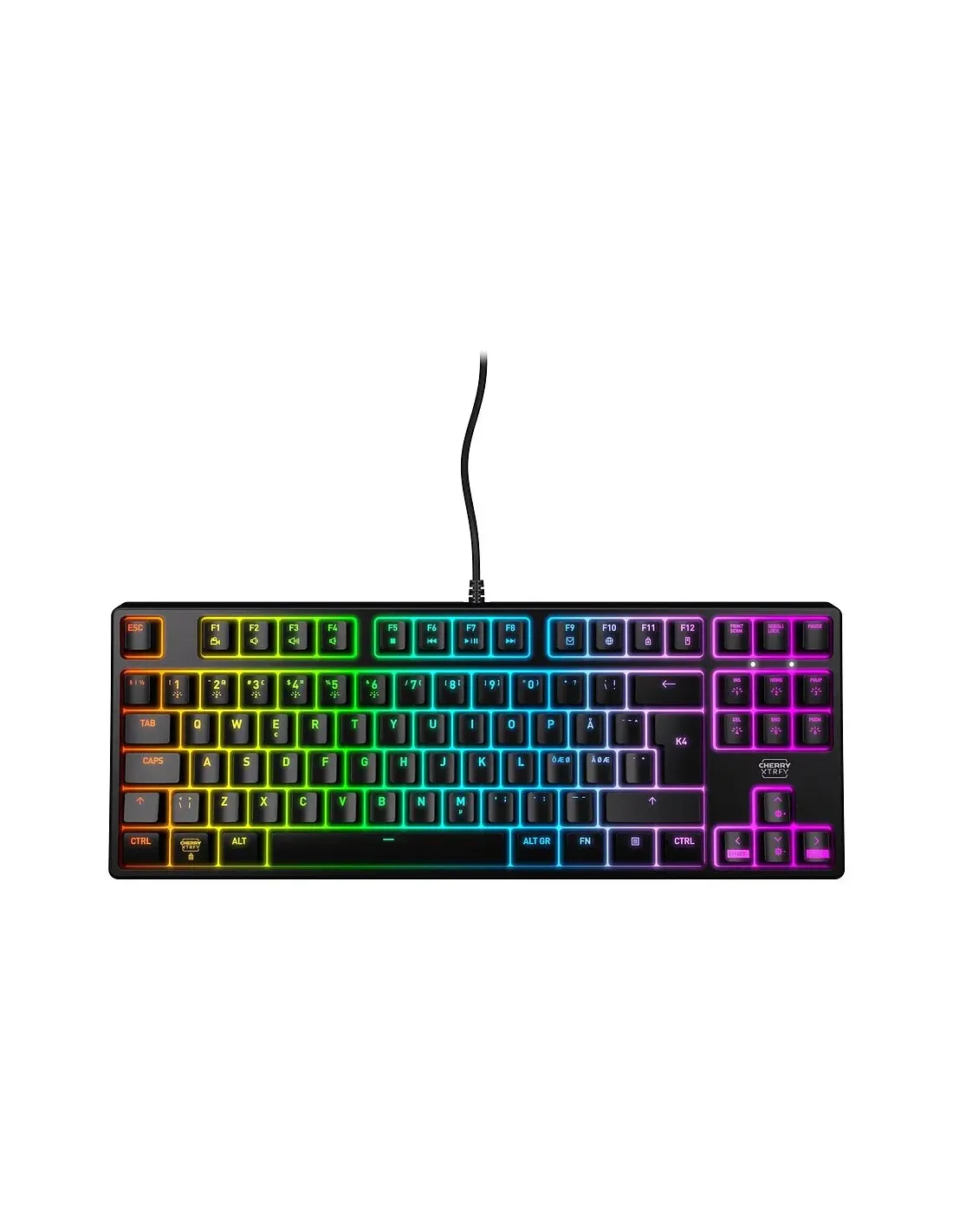 CHERRY XTRFY K4V2 RGB TKL. Formato del teclado: Tenkeyless (sin zona numérica) (80 - 87%). Estilo de teclado: Derecho. Tecnología de conectividad: Alámbrico, Interfaz del dispositivo: USB, Interruptor del teclado: Interruptor mecánico, Diseño de teclado: QWERTY. Tipo de retroiluminación: LED RGB. Uso recomendado: Juego. Color del producto: Negro