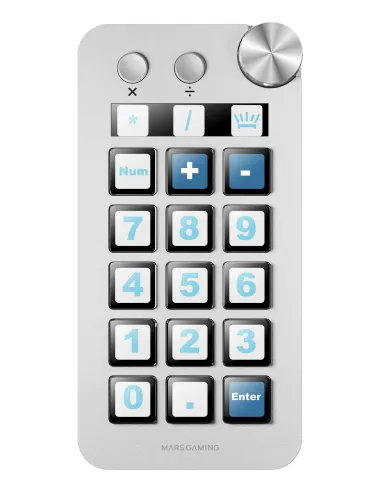 Mars Gaming Control Deck MSD-NEOW. Color de la carcasa: Blanco, Número de botones: 17 botones, Tipo de control: Botones, Giratorio. Voltaje: 5 V, Corriente de operación: 0,3 A. Ancho: 76 mm, Profundidad: 39 mm, Altura: 149 mm