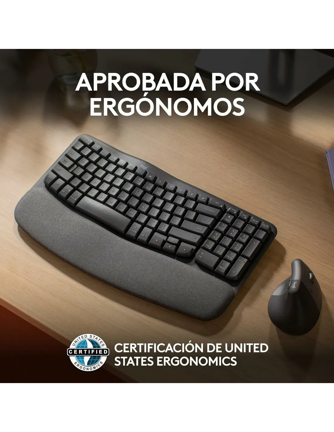 Características del Teclado Logitech Wave Keys Bluetooth NegroEl Logitech Wave Keys es un teclado ergonómico inalámbrico diseñado para quienes pasan largas jornadas escribiendo y buscan una alternativa cómoda, saludable y eficiente. Gracias a su diseño curvo con reposamuñecas acolchado y a su conectividad inalámbrica dual (Bluetooth y receptor USB Logi Bolt), este modelo es ideal para entornos de oficina, teletrabajo o uso diario intensivo.Diseño ergonómico con soporte viscoelásticoWave Keys se adapta a la forma natural de tus manos con un diseño ondulado que promueve una postura más relajada al escribir. El reposamanos integrado con espuma viscoelástica alivia la presión en las muñecas, ayudando a mantener la comodidad durante toda la jornada.Diseño curvo que facilita una posición naturalReposamuñecas acolchado para mayor soporteTeclado completo con distribución en español (QWERTY)Conectividad inalámbrica versátil y duraderaCon soporte para RF Wireless y Bluetooth, el teclado permite conectar hasta tres dispositivos y alternar entre ellos con facilidad. Además, su batería ofrece una autonomía excepcional de hasta 36 meses gracias a su bajo consumo y eficiencia.Conexión inalámbrica vía Bluetooth o receptor USB Logi BoltAlcance inalámbrico de hasta 10 metrosIncluye 2 pilas AAA con duración de hasta 3 añosExperiencia de escritura fluida y silenciosaEquipado con interruptores de membrana de perfil bajo, el Wave Keys ofrece una pulsación suave y silenciosa. Con una fuerza de actuación de 50 g y recorrido de 2,5 mm, se consigue un equilibrio perfecto entre comodidad y respuesta táctil.Vida útil de las teclas: hasta 10 millones de pulsacionesRecorrido de tecla: 2,5 mm | Actuación: 1,5 mmMaterial de teclas: ABS resistente al uso diarioCompatible con múltiples sistemas y personalizableGracias a su compatibilidad con Windows, macOS, Linux, ChromeOS, Android e iPadOS, es una opción versátil para cualquier entorno. Además, puedes personalizar accesos directos y funciones mediante el software gratuito Logi Options+.Compatible con los principales sistemas operativosMemoria interna de 256 KB para configuracionesSoftware Logi Options+ para ajustes personalizadosDiseño sostenible y contenido del embalajeEl Wave Keys cuenta con certificados de sostenibilidad como CarbonNeutral y FSC. Está fabricado con materiales duraderos y viene listo para usar con todo lo necesario.Certificados: CarbonNeutral, FSCIncluye receptor USB Logi Bolt y 2 pilas AAAGuía de inicio rápido incluidaOtras especificacionesDimensiones del teclado: 375,97 x 218,91 x 30,53 mmPeso: 750 gInterruptor de encendido/apagado integradoIndicadores LED para estado de conexión y bateríaAltura ajustable para mejor ergonomía