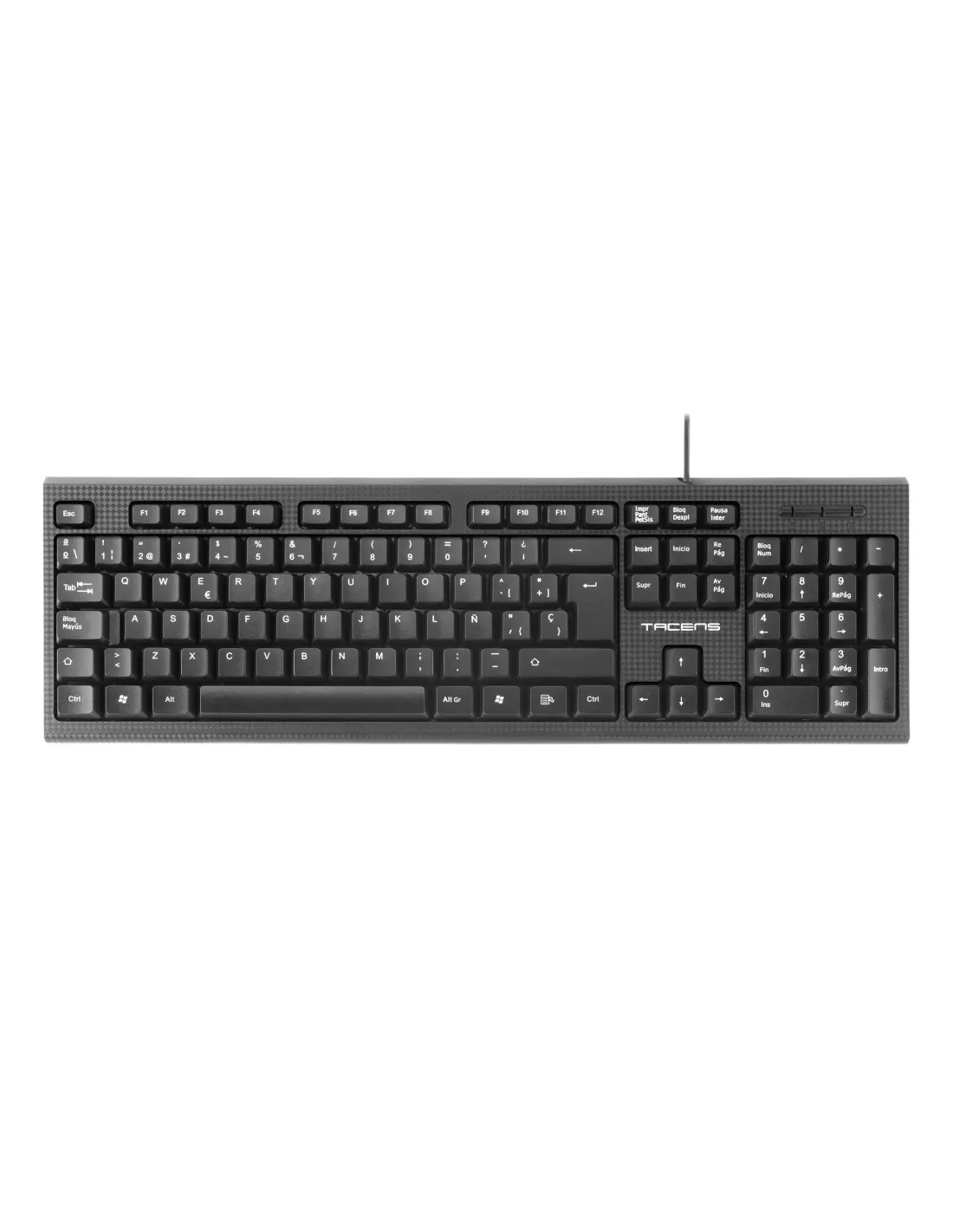 Pulsación profesional El AK0 cuenta con una membrana de alto rendimiento para ofrecer una pulsación precisa, perfecta para un teclado profesional de uso tanto doméstico como de oficina. Diseño ecológico El diseño del AK0 es producto de la ingeniería inteligente ecológica propia de la marca, creada en base a medidas de ahorro energético, reduciendo los materiales tóxicos utilizados en su fabricación y optimizando el producto al máximo para una huella de CO2 muy baja. Diseño e ingeniería inteligente ecológica con medidas de ahorro energético, reducción de materiales tóxicos y optimización al máximo. Marca Tacens Modelo AK0ES Tipo - Teclado USB Conexión - USB 2.0 Otras Características - Teclado profesional de alta calidad - Pulsación optimizada de alto rendimiento - Tamaño y peso optimizados - Durabilidad prolongada y prestaciones de calidad profesional - Compatible con Windows/Mac/Linux - Duración: 10000000 - Material: ABS - Corriente: 30mA - Voltaje: 5V - Dimensiones cable: 1.3 m - Dimensiones: 433 x 123 x 29 mm - Peso: 395g