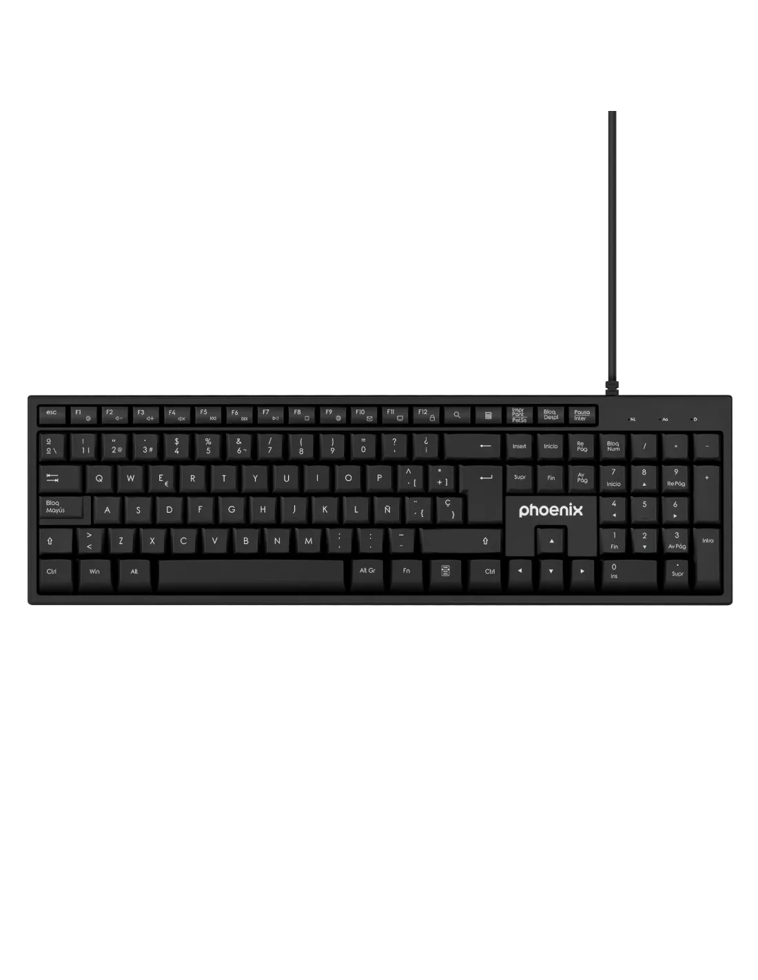 El teclado K100 de Phoenix Technologies combina la robustez con un estética clásica y estilizada. Con un diseño dinámico y una estructura resistente, el teclado K100 es ideal para el trabajo diario o para escribir obras infinitas. Un suave tacto en la pulsación sumado a sus 14 teclas multimedia, el teclado K100 se convertirá en tu mejor aliado. K100 te permite colocarlo en 2 posiciones: totalmente horizontal o inclinado. Además dispone de unos pads en la parte inferior que te darán una mejor estabilidad y fijación impidiendo que el teclado resbale sobre tu escritorio.Es compatible con ordenadores Windows, MacOS y Linux: solamente tienes que conectarlo a tu ordenador y automáticamente se configurará, sin necesidad de instalar ningún plugin o software adicional: Plug & Play.