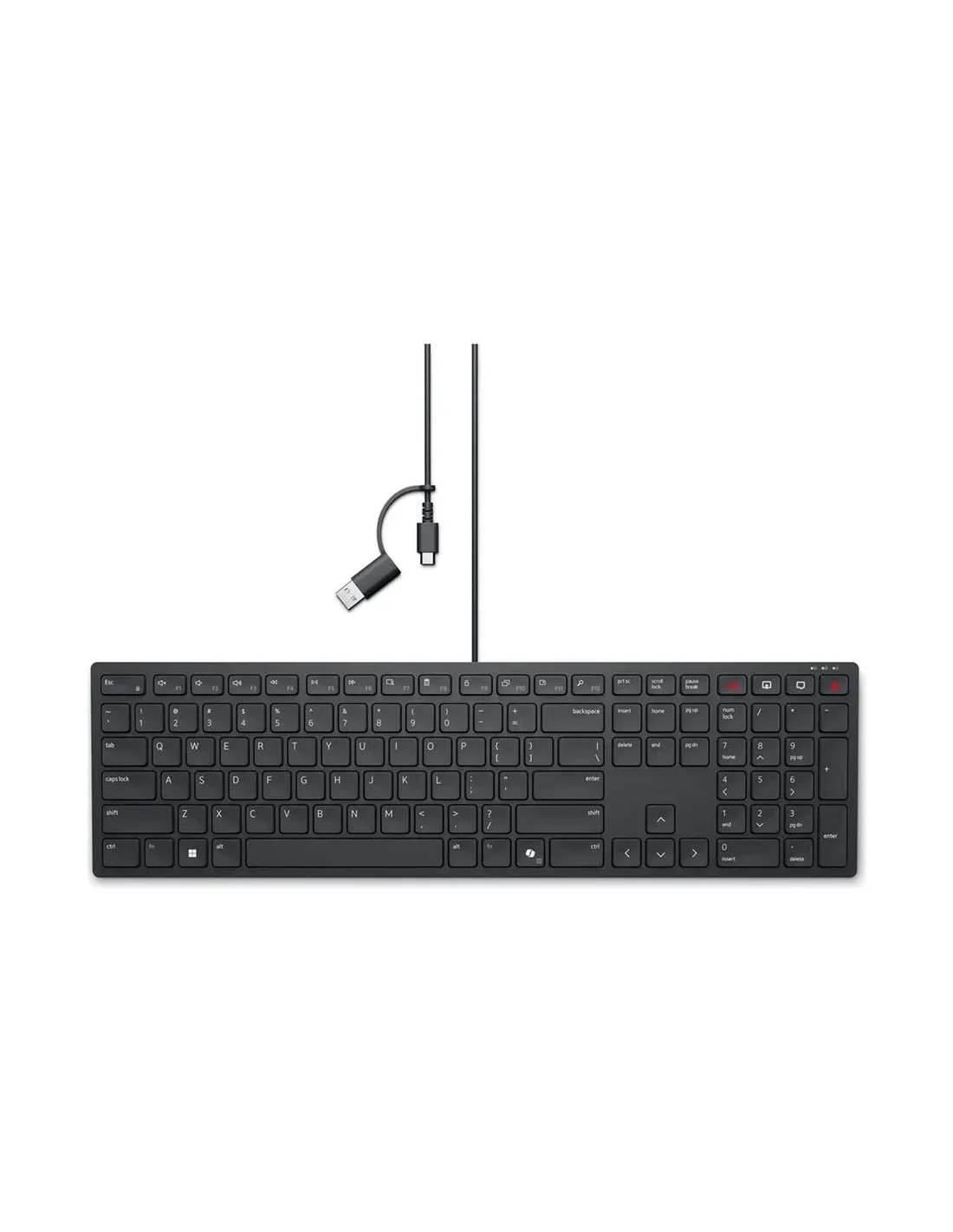 -TIPO DE DISPOSITIVOTecladoTecnología del teclado: ÉmboloLocalización y diseño: QWERTY españolInterfaz: USB, USB-CAltura ajustable: SíCaracterísticas: Teclado numéricoFunción de las teclas de acceso directo: Copilot, 15 programmable shortcut keys, volumen +, volumen -, sin sonido-DIMENSIONES Y PESOAnchura: 43.27 cmProfundidad: 12.21 cmAltura: 2.61 cmPeso: 460 g-DISEÑO Y PROTECCIÓNColor: NegroProtección: Resistente a salpicaduras-CONECTIVIDAD Y ACCESORIOSAccesorios incluidos: Adaptador de USB-C a USB-A-CUMPLIMIENTO DE NORMASCumplimiento de normas: AES-256-SOFTWARE / REQUISITOS DEL SISTEMASoftware incluido: Dell Peripheral Manager (solo para Windows)Sistema operativo requerido: Microsoft Windows 7 / 8.1 / 10 / 11, Apple MacOS, Linux, Red Hat Enterprise Linux 8.0, Ubuntu 18.04, Google Chrome OS, Android-INFORMACIÓN DE SOSTENIBILIDADContenido reciclado del producto: 65 % - plástico reciclado postconsumo