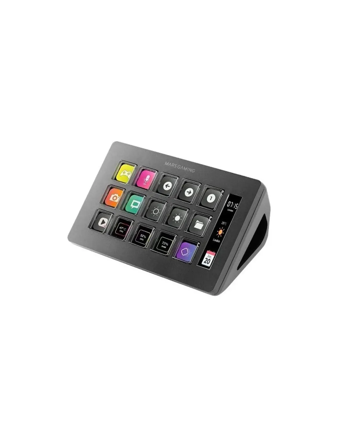 Mars Gaming MSD-ONE. Color de la carcasa: Negro, Número de botones: 15 botones, Tipo de control: Tocar. Ancho: 132 mm, Profundidad: 81 mm, Altura: 61 mmCaracterísticasColor de la carcasaNegroNúmero de botones15 botonesTipo de controlTocarTeclas LCDSiConector de USB tipo CSiSistema operativo Windows soportadoSiSistema operativo MAC soportadoSiPeso y dimensionesAncho132 mmProfundidad81 mmAltura61 mmPeso189 gAltura del paquete55 mm