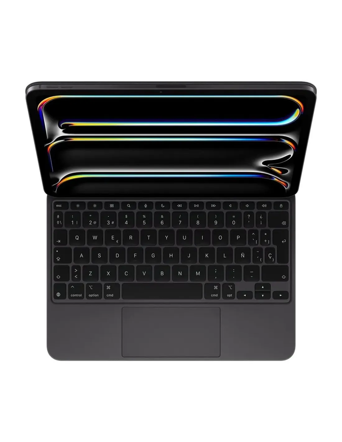 Características del Apple Magic Keyboard para iPad (QWERTY Español, Negro)El **Apple Magic Keyboard** es el complemento ideal para transformar tu iPad en una potente herramienta de productividad. Diseñado para ofrecer una experiencia de escritura cómoda y precisa, incorpora **retroiluminación, panel táctil integrado y un diseño flotante con conexión magnética**, que mejora la versatilidad del dispositivo sin comprometer el estilo ni la portabilidad. Es perfecto para estudiantes, profesionales o cualquier usuario que necesite trabajar, escribir y navegar con más comodidad.Diseño flotante con protección completaGracias a su diseño tipo folio, el Magic Keyboard protege tanto la parte frontal como la trasera del iPad, mientras que su sistema magnético permite **ajustar el ángulo de visualización** de forma precisa. El resultado es una estación de trabajo estable, elegante y fácil de transportar.Protección trasera y frontal integradaConexión magnética y ángulos ajustablesColor negro con acabado minimalistaEscritura precisa y táctil integradaEl teclado utiliza un mecanismo de tijera que proporciona una **respuesta silenciosa, firme y cómoda** en cada pulsación. Además, incorpora un **panel táctil compatible con gestos multitáctiles**, ideal para navegar por iPadOS de forma intuitiva y eficiente.Teclas retroiluminadas para trabajar con poca luzDistribución QWERTY en españolPanel táctil integrado con soporte gestualConectividad vía Smart ConnectorSe conecta al iPad mediante el **Apple Smart Connector**, sin necesidad de emparejamiento manual ni baterías. Además, incluye un puerto USB-C pasante para cargar el dispositivo, liberando el puerto del iPad para otros usos.Conexión directa por Smart ConnectorPuerto USB-C pasante para cargaNo necesita baterías ni configuración adicionalCompatibilidad con iPadOSRequiere **iPadOS 17.4 o superior** para aprovechar todas sus funciones, incluyendo la escritura avanzada, soporte para gestos táctiles y compatibilidad total con atajos de teclado como ajuste de volumen o brillo.Funciones de acceso rápido: volumen, brillo, etc.Compatibilidad con iPadOS 17.4 o superiorDiseñado específicamente para iPadOtras especificacionesTipo de teclado: TijeraTipo de dispositivo: Caja de teclado y folioGarantía limitada: 1 año