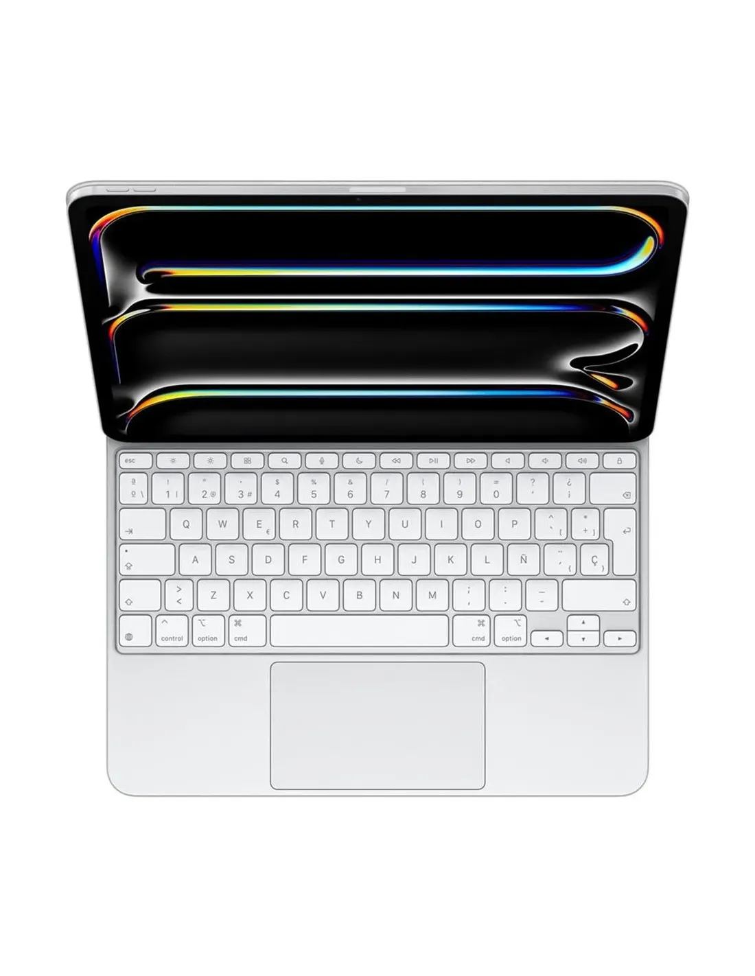 Características del Apple Magic KeyboardEl **Apple Magic Keyboard** es la opción ideal para quienes buscan una experiencia de escritura fluida, precisa y cómoda. Con su diseño elegante y su innovadora tecnología, este teclado integrado es perfecto para usuarios de dispositivos Apple que necesitan una solución compacta y eficiente, especialmente para el iPad. La **retroiluminación inteligente** y el **panel táctil** integrado ofrecen un rendimiento superior, mientras que la **conexión magnética** y los **ángulos de visualización regulables** aseguran una versatilidad única.Teclado con tecnología de tijeras y retroiluminaciónEl **Apple Magic Keyboard** utiliza una **tecnología de teclas de tijera** que proporciona una **escritura silenciosa y cómoda** con una **respuesta rápida**. Además, su **retroiluminación** ajustable optimiza la visibilidad en cualquier entorno, adaptándose a las condiciones de luz, lo que te permite trabajar incluso en lugares oscuros.Teclas con mecanismo de tijera para una escritura fluidaRetroiluminación ajustableTeclas de acceso directo para volumen y brilloConectividad y diseño prácticoEste teclado se conecta a tu dispositivo Apple mediante el **Apple Smart Connector**, lo que garantiza una **conexión estable** y **sin cables**. Además, su diseño de **conexión magnética** permite que lo fijes fácilmente al iPad, proporcionando un ángulo de visualización cómodo. El **USB-C pass-through** te permite cargar tu dispositivo mientras trabajas, sin la necesidad de desconectar cables.Conexión mediante Apple Smart ConnectorUSB-C pass-through para carga simultáneaÁngulos de visualización regulables con conexión magnéticaDiseño compacto y protección integradaEl Apple Magic Keyboard es **blanco y elegante**, con un diseño **ultracompacto** que facilita su transporte. Además, cuenta con **protección trasera y frontal** para mantener el teclado seguro cuando no está en uso, lo que lo convierte en un accesorio duradero y funcional para cualquier entorno.Diseño blanco y eleganteProtección trasera y frontal para mayor durabilidadTeclado compacto y ligeroCompatibilidad y requisitos del sistemaEl Apple Magic Keyboard es compatible con dispositivos que utilicen **iPadOS 17.4 o superior**, lo que asegura su **integración perfecta** con la mayoría de los modelos de iPad y ofrece una experiencia de uso fluida y rápida.Compatible con iPadOS 17.4 o superiorRequiere dispositivos Apple con Apple Smart ConnectorOtras especificacionesLocalización y diseño: QWERTY españolTipo de dispositivo: Caja de teclado y folioDispositivos integrados: Panel táctilGarantía: 1 año (garantía limitada)