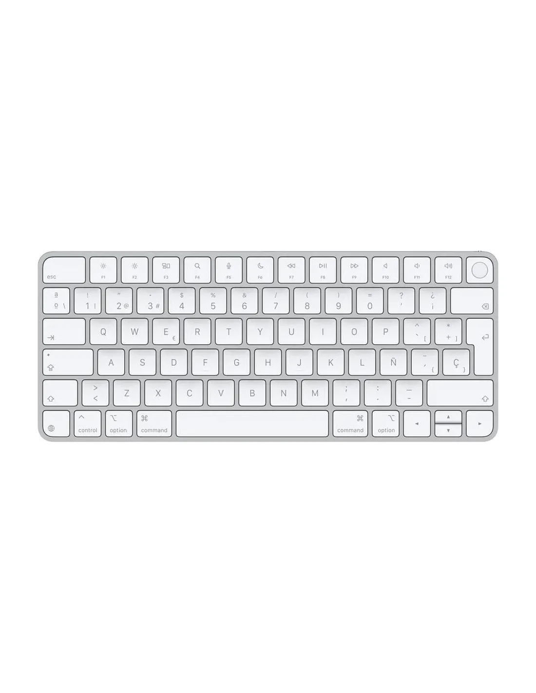 EspecificacionesTecladoUso recomendadoWhat the product should be used forUniversalTecnología de conectividadThe technology that enables connectivity of the device, e.g. wired or wireless.Inalámbrico y alámbricoInterfaz del dispositivoThe ports (sockets) where the device connects with other devices.USB + BluetoothDiseño de tecladoThe type of keys on a keyboardQWERTYIdioma del tecladoThe letters which are marked on the keys for convenience of the keyboard usage with specific language.EspañolFormato del tecladoKeyboard sizeTenkeyless (sin zona numérica) (80 - 87%)DiseñoEstilo de tecladoThe style of the keyboard e.g. straightDerechoColor del productoThe colour e.g. redPlata, BlancoCaracterísticasConector USBThe type of USB connector/port that this product has.USB Tipo CControl de energíaAlimentaciónWhat the power source is.Batería, USBTeclado tipo de batería Batería integradaFuente de cargaHow the battery is charged.USB Tipo CRequisitos del sistemaSistema operativo MAC soportadoMac operating systems e.g. OS X can be used with the device.Mac OS X 11.0 Big Sur, Mac OS X 12.0 Monterey, Mac OS X 13.0 Ventura, Mac OS X 14.0 SonomaPeso y dimensionesDimensiones de teclado (Ancho x Profundidad x Altura) 278,9 x 114,9 x 10,9 mmPeso del teclado 243 gContenido del embalajeNúmero de productos incluidosThe number of products that are included in the package.1 pieza(s)Cables incluidos USB Tipo COtras característicasCompatibilidadThe other productsMacBook Air (13-inch, M3, 2024) MacBook Air (15-inch, M3, 2024) MacBook Air (15-inch, M2, 2023) MacBook Air (13-inch, M2, 2022) MacBook Air (M1, 2020) MacBook Pro (14inch, 2023) MacBook Pro (16inch, 2023) MacBookPro (13inch, M2, 2022) MacBook Pro (14inch, 2021) MacBook Pro (16-inch, 2021) MacBook Pro (13-inch, M1, 2020) iMac (24inch, M4, 2024) iMac (24-inch, M3, 2023) iMac (24-inch, M1, 2021) Mac Studio (2023) Mac Studio(2022) Mac mini (2023) Mac mini (M1, 2020) Mac Pro (2023)