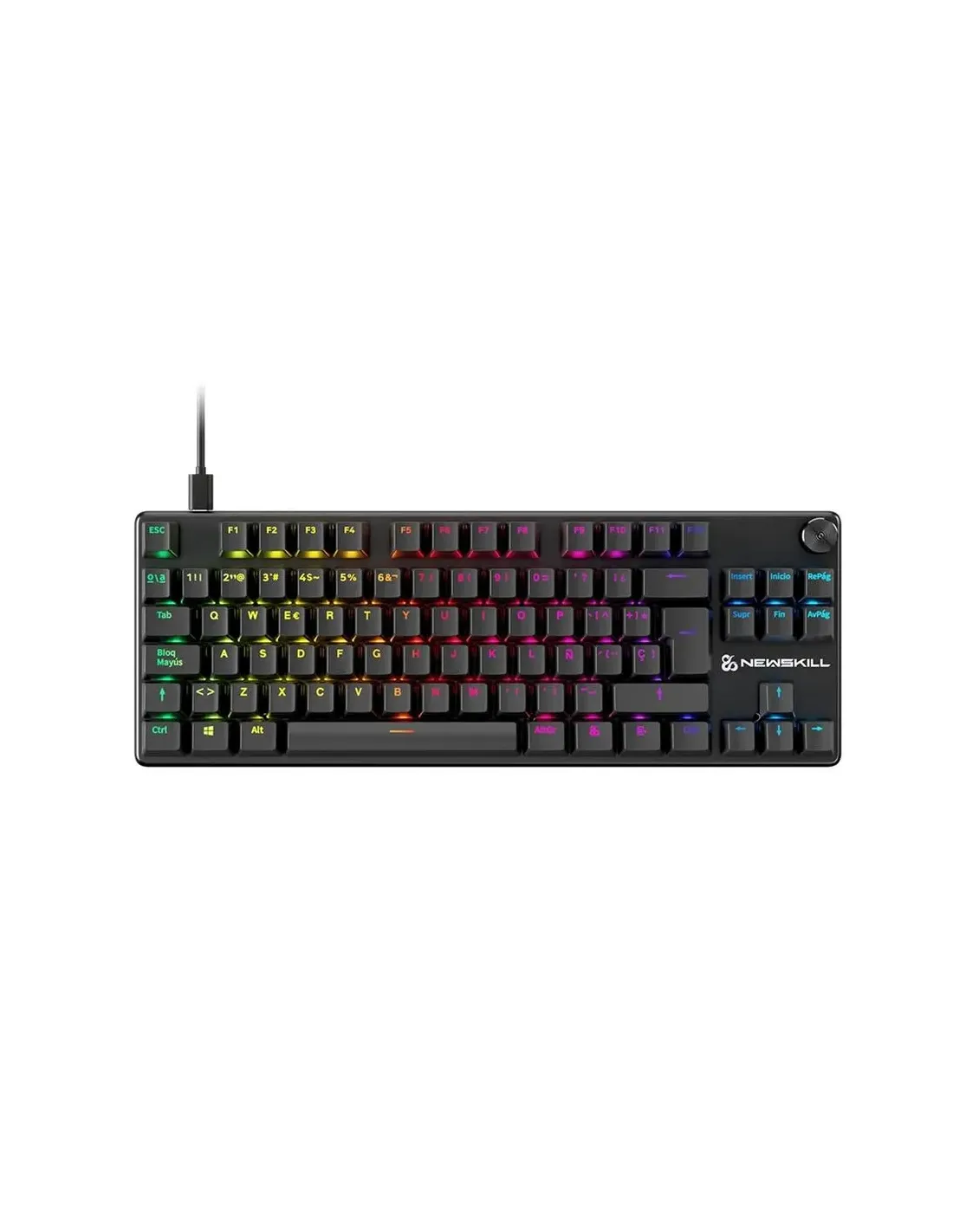 Características del Teclado Gaming Newskill Serike TKL V2El **Newskill Serike TKL V2** es un teclado mecánico compacto diseñado para gamers que buscan **precisión, velocidad y personalización total** en cada partida. Con un diseño **tenkeyless (TKL)** de 88 teclas, ofrece un formato más ligero y ergonómico, ideal para setups con espacio limitado o para quienes priorizan la movilidad sin renunciar al rendimiento profesional. Su estructura de **aluminio** y teclas de **doble inyección ABS** garantizan una gran durabilidad, mientras que su **iluminación RGB personalizable** lo convierte en una opción tan funcional como visualmente impactante.Switches intercambiables para una experiencia a medidaEste modelo incorpora switches **NewSwitch Rojos** de tipo lineal, que ofrecen una pulsación suave y rápida, perfectos para juegos de acción o shooters. Además, gracias a su sistema **hot-swappable**, puedes intercambiarlos fácilmente sin herramientas especiales. Incluye sets adicionales para adaptar el teclado a tu estilo.Switches NewSwitch Rojos (lineales)Incluye 8x Switches Verdes (clicky) y 8x Violetas (táctiles)Herramienta incluida para cambiar switches y teclasIluminación RGB total y control al instanteDisfruta de una iluminación completamente personalizable, tanto desde el propio teclado como mediante software. Cada tecla puede configurarse individualmente para lograr efectos visuales inmersivos o configuraciones funcionales para juegos concretos.RGB configurable desde teclado o softwareTeclas ABS de doble inyección resistentes y con gran visibilidadIncluye 8x teclas de juego personalizadas NewskillRendimiento avanzado para sesiones exigentesEl Serike TKL V2 ofrece un rendimiento de nivel competitivo, con **frecuencia de 1.000 Hz**, **100% antighosting** y **NKRO completo** para registrar cada acción con total precisión. Su conexión USB extraíble y la memoria integrada permiten conservar tus configuraciones incluso al cambiar de equipo.Frecuencia de actualización de 1.000 HzAnti-ghosting completo (NKRO)Memoria integrada para guardar perfilesDiseño compacto, resistente y funcionalEl chasis de aluminio no solo aporta un diseño moderno y profesional, sino también una gran resistencia al uso intensivo. Además, el teclado incluye **rueda de volumen integrada**, altura ajustable en dos posiciones y distribución española ISO con tecla "ñ", ideal para usuarios nacionales.Chasis de aluminio robustoAltura regulable en 2 nivelesDistribución QWERTY en español (ISO)Otras especificacionesFormato: TKL (Tenkeyless), 88 teclasConexión: USB tipo A, extraíbleDimensiones: 12,6 x 35,5 x 3,2 cmPeso: 0,98 kgGarantía: 3 años