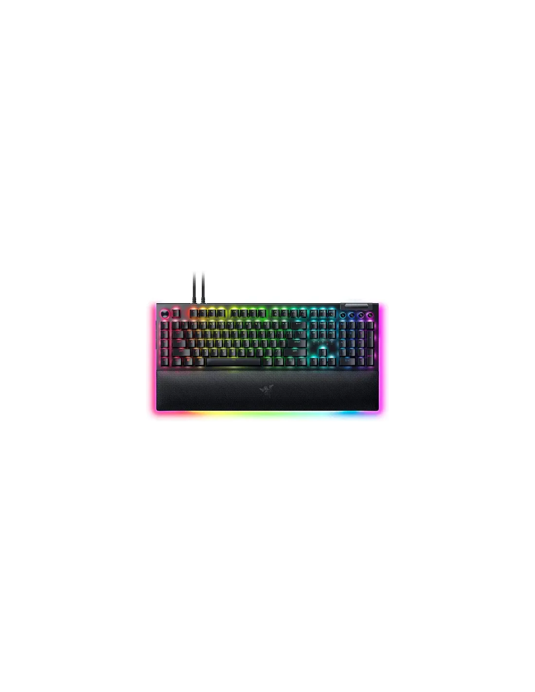 Teclado razer blackwidow v4 pro green con switches mecánicos verdes Razer para una ejecución precisa con una sensación de clic al tacto Iluminación individual de cada tecla e inferior inmersiva con tecnología Razer Chroma RGB Dial de selección Razer y 8 teclas macro dedicadas para un máximo dominio al alcance de la mano .Rueda multifunción y 4 teclas multimedia para un control más práctico. Reposa muñecas de piel sintética afelpada con iluminación inferior para una mayor comodidad y estilo de juegoTeclas de ABS de doble inyección para resistir el uso intenso.