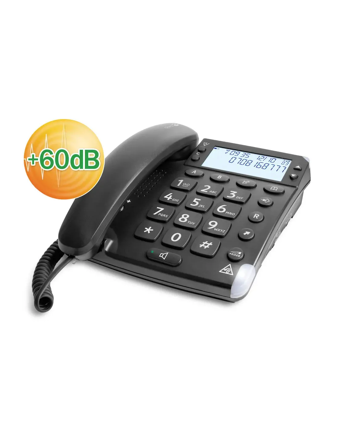 Doro Magna 4000 es una elección elegante para las personas con dificultad auditiva de moderada a grave.Pulsa el botón de amplificación para elevar inmediatamente el volumen del auricular en +60 dB y ajusta el tono para disfrutar de una calidad de sonido nítida que se adapte a tus necesidadesindividuales.El timbre excepcionalmente alto se complementa con una luz intermitente cuando alguien llama.Los botones y las teclas rápidas de gran tamaño hacen que este teléfono resulte muy fácil de usar.También cuenta con una pantalla que muestra la identificación de llamada, la agenda de contactos y otras funciones.Volumen del auricular de hasta +60 dBTono ajustable para adaptarse a necesidades auditivas individualesPantalla para mostrar los nombres y los númerosCaracterísticas claveTimbre amplificadoMemoria de números entrantes 50Pantalla fácil de leerHAC (compatible con audífonos)Sonido alto y claroTeléfono con altavozIndicador Visual de llamadaCaracterísticas principalesContadorRelojMarcación previaRecordatoriosPosiciones del registro de llamadas 50Memorias de un solo botón 2Posiciones de la agenda 50Memoria de marcación del último número 5Pantalla de la unidad basePantalla alfanuméricaPantalla con retroiluminaciónCaracteres grandes en pantallaTamaño de la pantalla (alt. x anch. mm) 82 x 32Sonidos y señalesAjuste de la desconexión del timbreAjustes del control de volumen, sin desconexión 2AcústicaAmplificación máxima de recepción (dB) 60Volumen máximo de timbre (dB[A]) a 1 metro 90Control de volumen giratorioIdentificador del entranteSello de fecha y hora - reloj internoVisualización del nombre de la agenda telefónicaErgonomíaFácil de agarrar, auricular cómodoAuricular fácil de colocarBotones de alto contraste con el acabado de baja reflexividadSe puede colocar en la paredTecnologíaPSTN