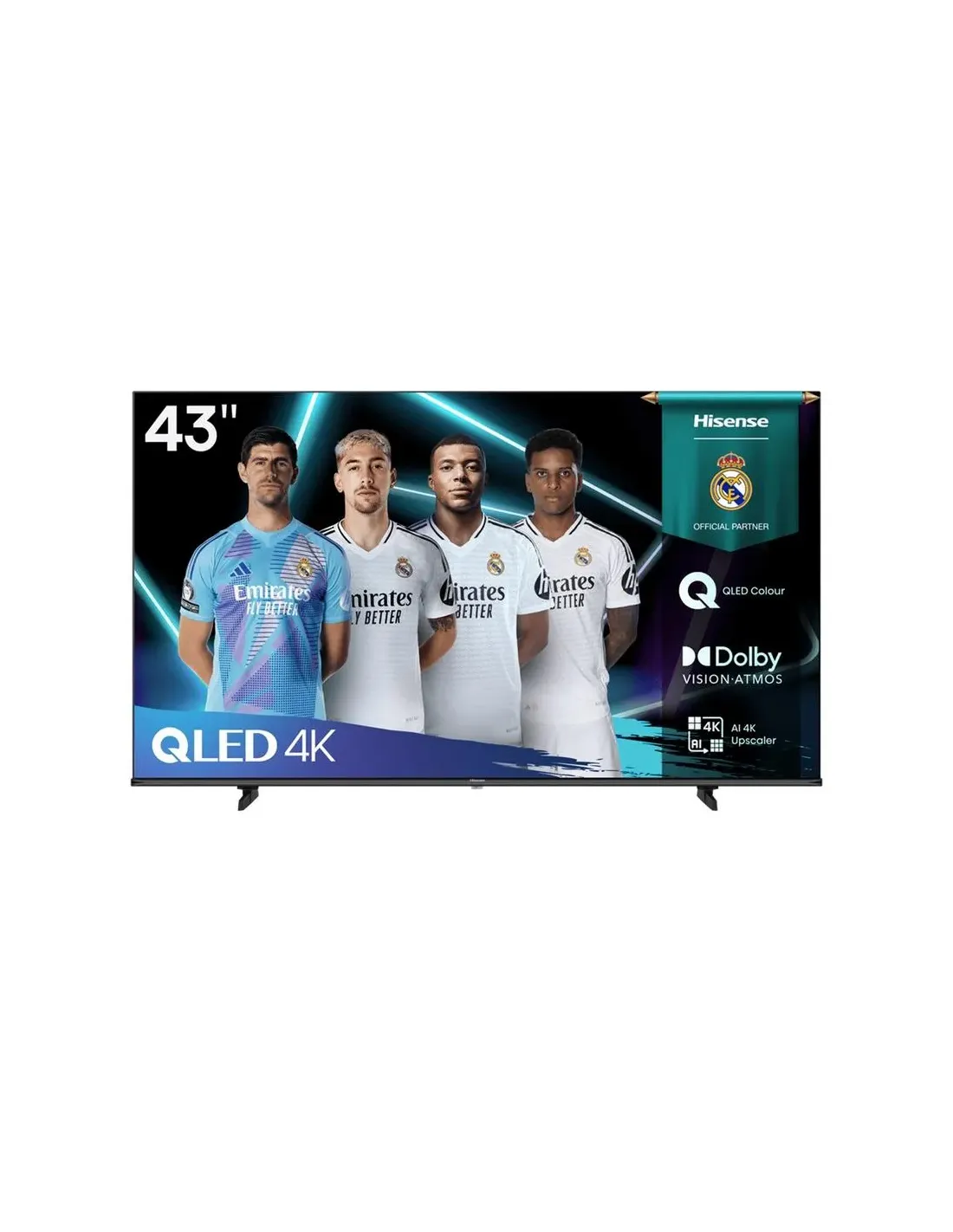 - SERIE E7Q- MODELO 43E7Q- EAN 6942351418407- DISEÑO Y MATERIALES Material cubierta delantera: Plástico / Negro Material cubierta trasera: Plástico / Negro Diseño del marco: Sin marcos- TIPO DE TV QLED TV- PANTALLA Tipo de panel: VA Relación de aspecto: 16:9 Tamaño: 43 pulgadas / 108 cm Área visible: 4982.8 cm² Resolución: 3840 × 2160 (Ultra HD) Ángulo de visión: 178° Profundidad de color: 8 Bit + FRC Color gamut DCI-P3: 0.9 Wide Color Gamut: Sí Tecnología Quantum Dot: Sí Frecuencia V-Sync: 60 Hz Contraste: 4000:1 Brillo típico: 275 nits Nivel de negro: 0.2 nits Tecnología retroiluminación: QLED & DLED HDR10 / HLG / Dolby Vision: Sí- RENDIMIENTO Procesador: Quad Core / MT9603 Escalado UHD: AI 4K Upscaler MEMC: Sí Decodificación: HEVC (H.265), VP8, VP9, AVC (H.264), MPEG4, MPEG1/2, WMV3, AV1, VC1- AUDIO Potencia de salida: 2 x 7W Tecnologías de audio: Dolby MS12, DTS:X, AC-4, MPEG-H NICAM / A2 Stereo: Sí Ecualizador: Sí Sonido especial: TV Mode EzPlay 2.0- SMART TV Y FUNCIONES Sistema operativo: VIDAA U9 Reproductor multimedia: Sí Modo Hotel: Sí Control por voz desde el mando App para smartphone: VIDAA- CONTENIDO DE INTERNET Apps internacionales: Netflix, Prime Video, Disney+, MAX, SkyShowtime, DAZN, Movistar+, Youtube, PlutoTV Apps específicas en España: miTele, Atres Player, RTVE a la Carta- RECEPCIÓN Y SINTONIZACIÓN Sintonizador: Sí Twintuner: No Soporte LCN: Sí Teletexto: Sí EPG: 8 días hacia adelante, 7 días hacia atrás (solo UK) Control parental: Sí Ordenación de canales exportable y editable: Sí Lista de canales favoritos: 4 PVR / Time Shift: Sí- CONECTIVIDAD Common Interface (CI+/CI+ ECP): Sí HDMI1: HDMI 2.1 (ALLM, VRR, 48?60Hz) HDMI2: HDMI 2.1 (ALLM, VRR, 48?60Hz) HDMI3: HDMI 2.1 (eARC, ALLM, VRR, 48?60Hz) USB (2.0): 2 Salida S/PDIF: 1 Entrada Audio L/R: 1 Salida auriculares: 1 Entrada AV: 1 Puerto Ethernet RJ45: Sí WiFi: IEEE 802.11 a/b/g/n/ac (2.4G y 5G) Bluetooth: BT 5.0- EFICIENCIA ENERGÉTICA Fuente de alimentación: 100V ~ 240V, 50/60 Hz Clase energética SDR: E Clase energética HDR: G Consumo en uso: 100 W Consumo standby: 0.5 W Consumo en red en standby: ?2 W Consumo SDR cada 1000h: 48 kWh Consumo HDR cada 1000h: 81 kWh Ratio de luminancia: >,220 nits Conformidad RoHS: Contiene mercurio y plomo según exención- PESO Y DIMENSIONES Peso con base: 6.9 kg Peso sin base: 6.8 kg Peso con embalaje: 10 kg Dimensiones con base: 963 × 238 × 614 mm Dimensiones sin base: 963 × 74 × 560 mm Dimensiones del embalaje: 1088 × 132 × 654 mm Compatibilidad VESA: 200 × 300 mm Distancia máxima entre patas: 765 mm- ACCESORIOS Base: Negro Mando a distancia: ERF2B38H (Pan-EU) Pilas mando: AAA x 2 Manual de usuario: Sí Guía de inicio rápido: Sí Cable de alimentación: Sí- FORMATOS COMPATIBLES Vídeo: .mp4, .mov, .mkv, .ts, .avi, .wmv, .flv, .webm Audio: .wav, .mp3, .m4a, .aac, .wma, .ac3, .flac, .opus Imagen: .jpg, .jpeg, .png, .bmp, .gif- FUNCIONES DESTACADAS Colores QLED: más de mil millones de colores vivos Dolby Vision + Dolby Atmos: experiencia audiovisual cinematográfica Escalador AI 4K: mejora el contenido a resolución cercana a 4K AI Smooth Motion: movimiento fluido y sin desenfoques Modo Juego PLUS: VRR, ALLM y barra de control Modo Filmmaker: visualización como fue concebida por el director Barra de Juegos: control en tiempo real de tus partidas Sensor de luz por IA: ajusta brillo para ahorrar energía Share to TV: comparte contenido desde tu móvil VIDAA Smart TV: interfaz fluida y personalizada EzPlay: emparejamiento fácil con barra de sonido