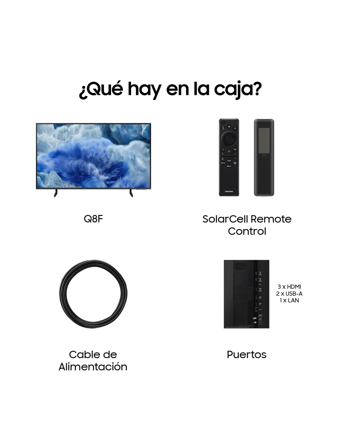 Samsung TV 75" QLED Q8F 4K Vision AI Smart TV 2025. Diagonal de la pantalla: 190,5 cm (75"), Resolución de la pantalla: 3840 x 2160 Pixeles, Tipo HD: 4K Ultra HD, Tecnología de visualización: QLED, Forma de la pantalla: Plana, Tipo de retroiluminación LED: LED dual. Smart TV. Tecnología de interpolación de movimiento: Motion Xcelerator, Relación de aspecto nativa: 16:9. Formato de señal digital: DVB-C, DVB-S2, DVB-T2. Wifi, Ethernet. Color del producto: Gris
