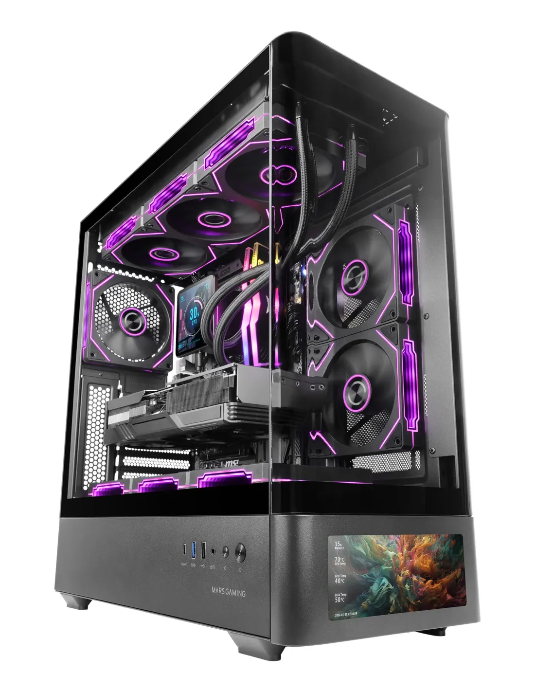 La MC‑LCDPRO es una caja gaming ATX creada para mostrar y controlar tu PC desde el propio chasis: pantalla IPS LCD integrada de 7,2”, cristal templado curvado sin marco y USB‑C de última generación. Su interior de doble cámara maximiza el orden y el flujo de aire, con un diseño panorámico que convierte tu setup en un escaparate técnico y estético a partes iguales.