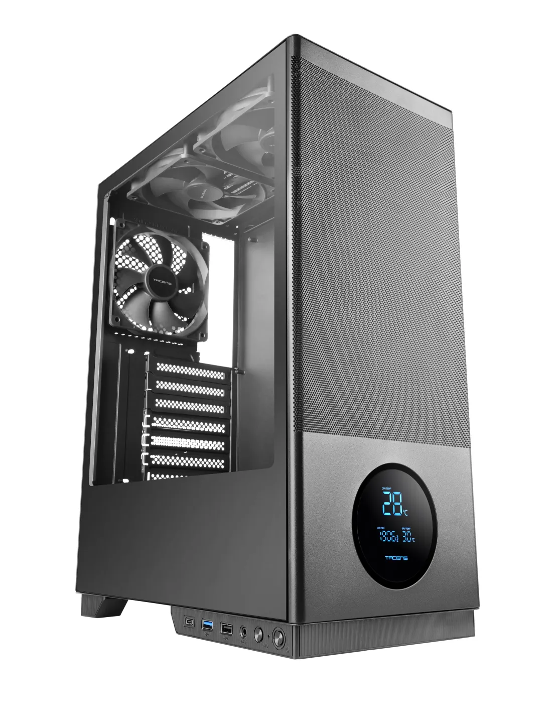 La pantalla circular del frontal muestra temperaturas de CPU y GPU y revoluciones del ventilador en tiempo real, para un control inmediato del sistema sin abrir software. Manteniendo la esencia de la caja Sagitta original lanzada hace 20 años, ahora con un look limpio y moderno.