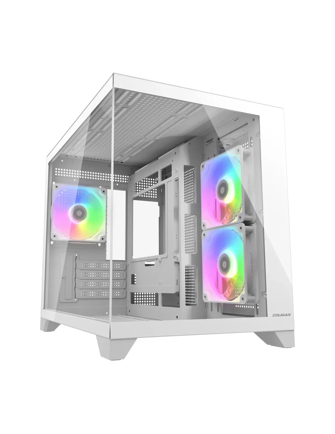 COUGAR FV150 MINI RGB. Factor de forma: Mini Tower, Tipo: PC, Color del producto: Blanco. Ventiladores laterales instalados: 2x 120 mm, Diámetro de ventiladores secundarios soportados: 120,140 mm, Ventiladores traseros instalados: 1x 120 mm. Tamaños de disco duro soportados: 2.5,3.5". Ancho: 285 mm, Profundidad: 435 mm, Altura: 365 mm. Ancho del paquete: 495 mm, Profundidad del paquete: 410 mm, Altura del paquete: 350 mm