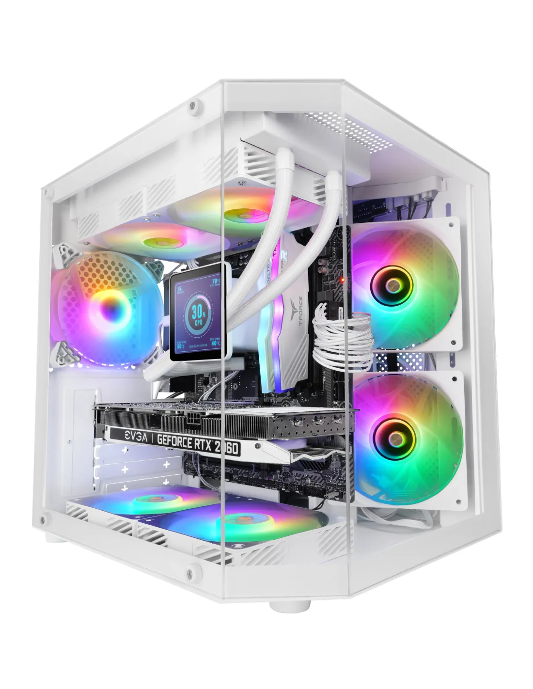 Su diseño panorámico MicroATX compacto con triple cristal templado continuo, estructura de doble cámara y gran capacidad interna te permite mostrar tu hardware con estilo y mantener un rendimiento térmico sobresaliente. Con ventilador trasero FRGB incluido, soporte para hasta 7 ventiladores y refrigeraciones líquidas de hasta 240 mm, está lista para cualquier desafío en el menor espacio
