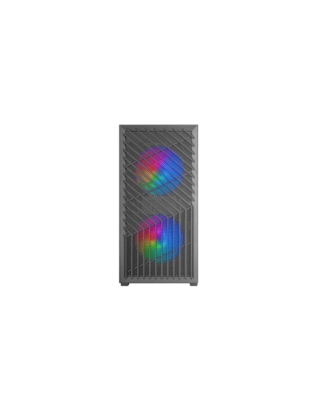 El frontal de la MC-VORTEX presenta un innovador diseño mesh geométrico que maximiza el flujo de aire y añade un toque de estilo futurista a tu setup. Este patrón angular no solo permite una ventilación eficiente para mantener el interior de tu PC siempre fresco, sino que también deja ver la impresionante iluminación FRGB Rainbow de los ventiladores frontales, creando un efecto visual deslumbrante mientras mantienes tu equipo a la temperatura ideal.