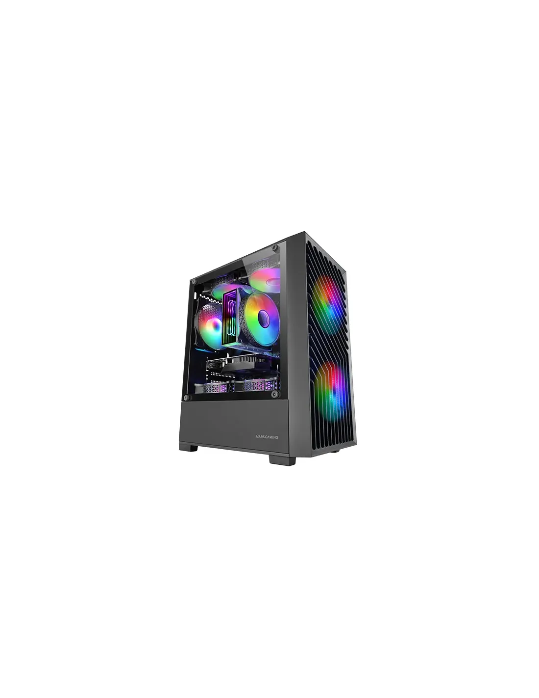 Mars Gaming MC- VORTEX, Caja Gaming MicroATX, Frontal Mesh Geométrico, Ventana Lateral Cristal Templado, 3x Ventiladores FRGB Rainbow 120mm, Minitorre PC Compacta con Diseño Doble Cámara, Negro. Factor de forma: Mini Tower, Tipo: PC, Color del producto: Negro. Ubicación de fuente de alimentación: Fondo, Factores de forma de la fuente de alimentación compatibles: ATX. Ventiladores frontales instalados: 2x 120 mm, Diámetro de ventiladores frontales soportados: 120 mm, Ventiladores traseros instalados: 1x 120 mm. Tamaños de disco duro soportados: 2.5,3.5". Ancho: 205 mm, Profundidad: 325 mm, Altura: 390 mm
