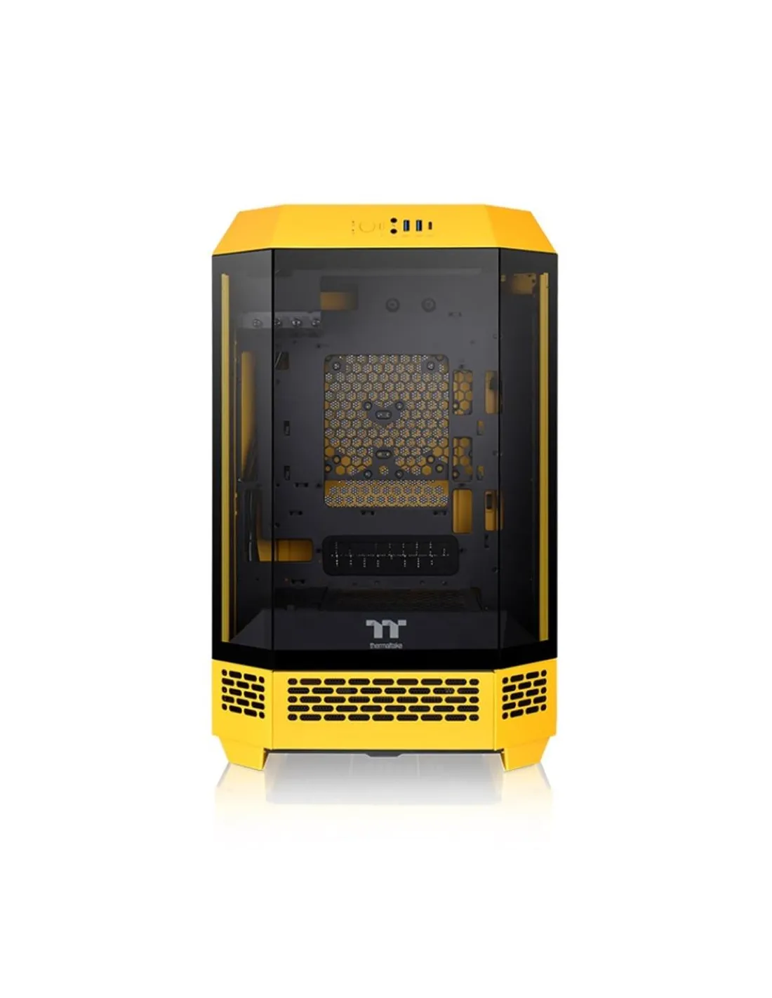 La **Thermaltake The Tower 300 Bumblebee Edition** es una caja compacta de tipo **Micro Torre**, diseñada para quienes buscan un equilibrio perfecto entre rendimiento térmico, diseño llamativo y una excelente capacidad de ampliación. Con un formato vertical distintivo y acabados en **color amarillo vibrante**, esta caja destaca tanto en setups de oficina como en configuraciones gaming compactas. Está pensada para usuarios que quieren un chasis elegante, con buena ventilación y espacio optimizado para componentes de alto rendimiento.