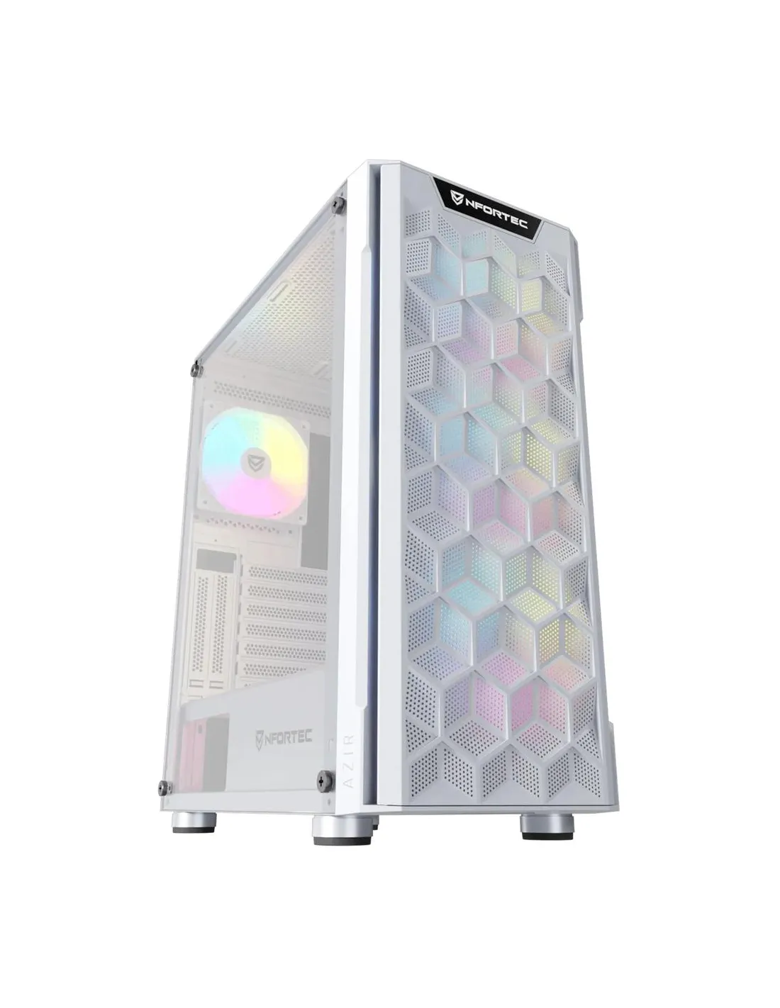 La Nfortec Azir en color blanco es una caja semitorre diseñada para montar equipos gaming o de alto rendimiento con una excelente relación entre flujo de aire, estética y espacio interior. Con un diseño elegante en blanco, panel lateral de cristal templado y ventiladores A-RGB incluidos, es ideal para quienes buscan una configuración llamativa sin renunciar a la ventilación ni a la compatibilidad con componentes exigentes.