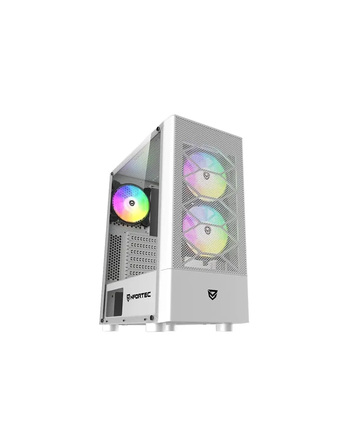Características de la Caja de PC Gaming Nfortec Caelum Semitorre ATX RGB BlancaLa Nfortec Caelum es una caja semitorre diseñada para los entusiastas del gaming que buscan un chasis con buena ventilación, diseño moderno y espacio para componentes de alto rendimiento. Con un panel lateral de cristal templado y ventiladores RGB incluidos, ofrece una excelente relación calidad-precio para montar un equipo atractivo y funcional.Diseño gaming con panel de cristal templadoSu estructura combina acero SPCC de 0,5 mm con elementos en ABS y un elegante panel lateral de cristal templado que permite lucir los componentes internos con iluminación RGB. Su diseño compacto no sacrifica espacio interno, permitiendo una fácil instalación y buena organización del cableado.Dimensiones: 395 x 200 x 430 mmPanel lateral de cristal templadoPeso: 3,3 KgVentilación eficiente con RGB incluidoLa Nfortec Caelum viene equipada con 3 ventiladores RGB de 120 mm ya instalados (2 frontales y 1 trasero), con posibilidad de ampliar hasta un total de 6 ventiladores. Esto asegura un flujo de aire constante para mantener tu configuración a una buena temperatura.Incluye 3 ventiladores RGB de 120 mmSoporte para hasta 6 ventiladores (frontal, trasero y superior)Filtros antipolvo magnético superior e inferiorCompatibilidad y espacio para componentesEsta semitorre ofrece una amplia compatibilidad para placas base y componentes modernos. Además, permite instalar tarjetas gráficas de gran tamaño y disipadores de CPU de altura considerable, lo que la hace apta tanto para setups gaming como profesionales.Placas base compatibles: ATX, MicroATX, ITXEspacio para GPU de hasta 320 mmSoporte para disipadores de CPU de hasta 160 mmConectividad y almacenamientoEn el panel frontal incluye todo lo necesario para el día a día: puertos USB 3.0 y 2.0, jack de audio/micrófono y botones de encendido/reset. En su interior, incorpora varias bahías para discos tanto SSD como HDD, ideales para mantener tus juegos y archivos organizados.USB 3.0 x1, USB 2.0 x2Entrada combinada auricular/micrófono2x bahías de 2,5" + 2x bahías de 3,5"Otras especificacionesFuente de alimentación ATX (no incluida), ubicada en la parte inferior7 ranuras de expansión PCI