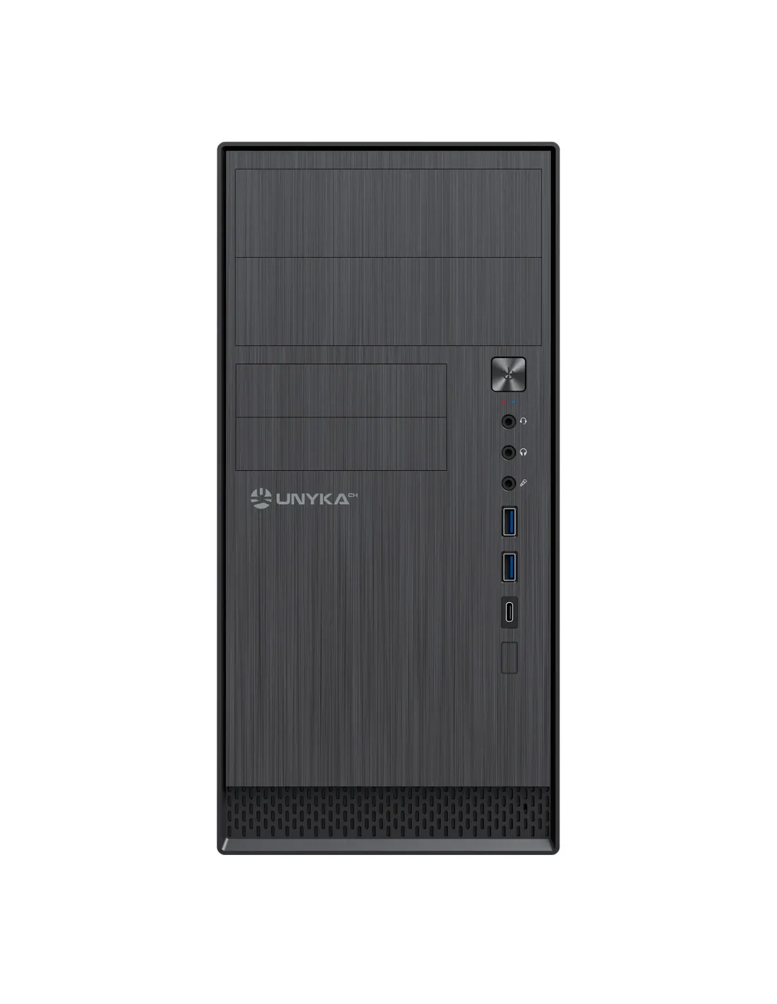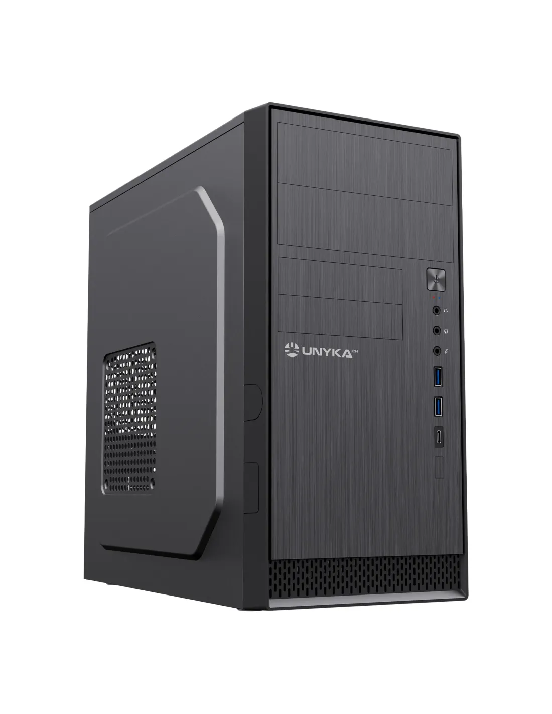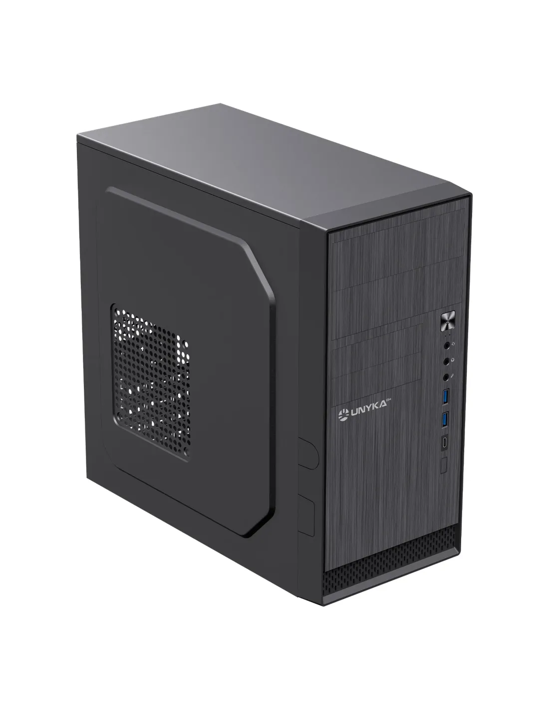 Características de la Caja Micro ATX Unyka Aero C12La Unyka Aero C12 es una caja Micro ATX diseñada para quienes buscan elegancia, funcionalidad y compatibilidad en un formato compacto. Con un frontal en aluminio cepillado y un diseño sobrio, encaja perfectamente tanto en entornos de oficina como en el hogar, ofreciendo una gestión de cables eficiente y amplias opciones de almacenamiento y refrigeración.Diseño elegante y funcionalSu frontal con acabado de aluminio cepillado aporta una apariencia profesional y resistente. La disposición interna está optimizada para un montaje limpio y ordenado, con la fuente de alimentación situada en la parte superior para facilitar la gestión de cables.Color: NegroMateriales: ABS, metal, SGCCFactor de forma: Micro TorreDimensiones: 35,3 cm (alto) x 17,8 cm (ancho) x 37,2 cm (profundidad)Peso: 2,4 kgConectividad frontal avanzadaLa Aero C12 incorpora una completa panelera frontal de puertos que facilita la conexión rápida de periféricos y dispositivos modernos.2 puertos USB 3.2 Gen 1 Tipo A1 puerto USB Tipo CConectores de audio HD y micrófonoBotón de encendido/apagado e indicadores LEDAmplia capacidad de almacenamientoA pesar de su tamaño compacto, ofrece espacio suficiente para montar diferentes unidades de almacenamiento, admitiendo tanto discos HDD como SSD.5 bahías internas de 3,5"2 bahías internas de 2,5"Compatibilidad con discos de 2,5" y 3,5"Compatibilidad con componentesEsta caja soporta hardware de alto rendimiento dentro de un formato Micro ATX, permitiendo configuraciones equilibradas para trabajo o uso doméstico.Placas base Micro ATXTarjetas gráficas de hasta 29,5 cmDisipadores de CPU de hasta 14 cm de alturaFuente de alimentación ATX (no incluida)Opciones de refrigeración versátilesPermite la instalación de ventiladores en distintas posiciones para optimizar el flujo de aire según las necesidades del usuario.Frontal: 80/92/120 mm (x1)Lateral: 120 mm (x1)Trasero: 80/92 mm (x1)Certificaciones y uso recomendadoLa Aero C12 cuenta con certificados CE y RoHS, garantizando el cumplimiento de estándares de calidad y seguridad. Es ideal para entornos de hogar u oficina, donde se requiera un equipo compacto y eficiente.Otras especificacionesNúmero de ranuras de expansión: 3Ventana lateral: NoIndicadores LED: SíAdecuada para: Hogar / Oficina
