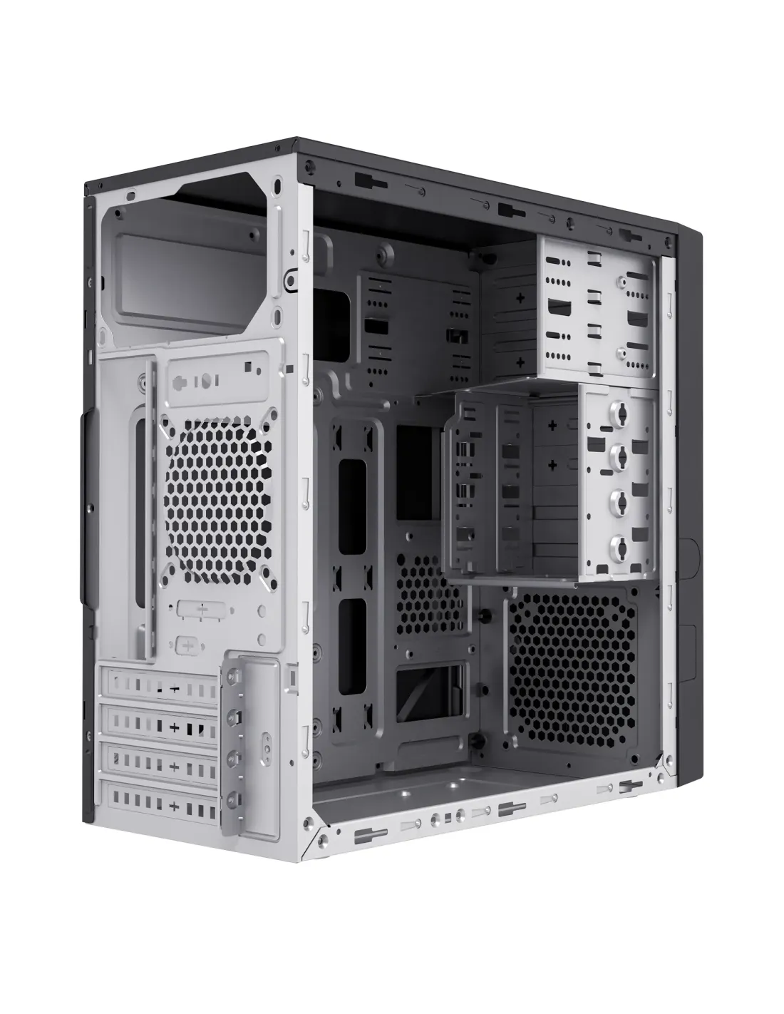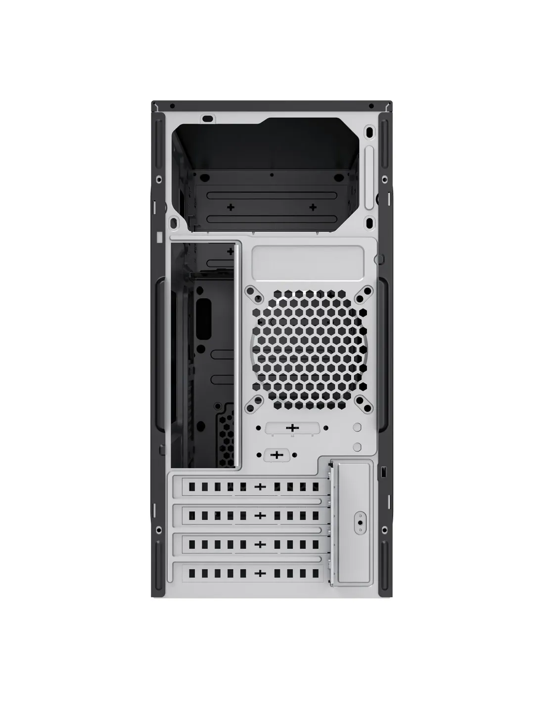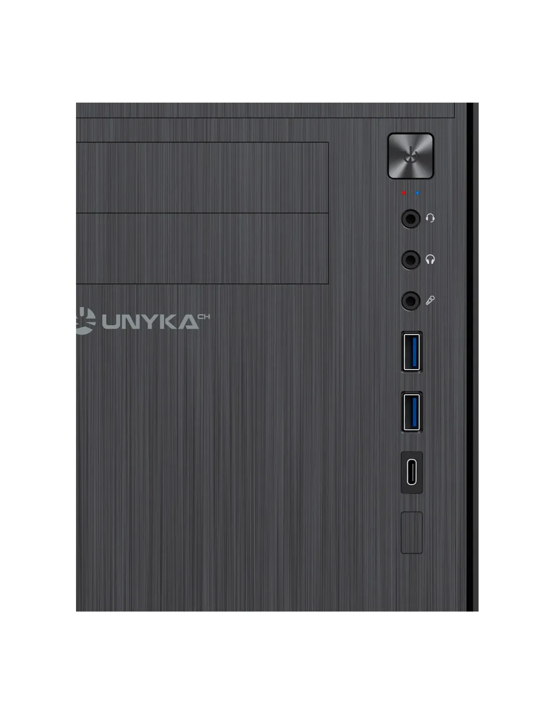 Características de la Caja Micro ATX Unyka Aero C12La Unyka Aero C12 es una caja Micro ATX diseñada para quienes buscan elegancia, funcionalidad y compatibilidad en un formato compacto. Con un frontal en aluminio cepillado y un diseño sobrio, encaja perfectamente tanto en entornos de oficina como en el hogar, ofreciendo una gestión de cables eficiente y amplias opciones de almacenamiento y refrigeración.Diseño elegante y funcionalSu frontal con acabado de aluminio cepillado aporta una apariencia profesional y resistente. La disposición interna está optimizada para un montaje limpio y ordenado, con la fuente de alimentación situada en la parte superior para facilitar la gestión de cables.Color: NegroMateriales: ABS, metal, SGCCFactor de forma: Micro TorreDimensiones: 35,3 cm (alto) x 17,8 cm (ancho) x 37,2 cm (profundidad)Peso: 2,4 kgConectividad frontal avanzadaLa Aero C12 incorpora una completa panelera frontal de puertos que facilita la conexión rápida de periféricos y dispositivos modernos.2 puertos USB 3.2 Gen 1 Tipo A1 puerto USB Tipo CConectores de audio HD y micrófonoBotón de encendido/apagado e indicadores LEDAmplia capacidad de almacenamientoA pesar de su tamaño compacto, ofrece espacio suficiente para montar diferentes unidades de almacenamiento, admitiendo tanto discos HDD como SSD.5 bahías internas de 3,5"2 bahías internas de 2,5"Compatibilidad con discos de 2,5" y 3,5"Compatibilidad con componentesEsta caja soporta hardware de alto rendimiento dentro de un formato Micro ATX, permitiendo configuraciones equilibradas para trabajo o uso doméstico.Placas base Micro ATXTarjetas gráficas de hasta 29,5 cmDisipadores de CPU de hasta 14 cm de alturaFuente de alimentación ATX (no incluida)Opciones de refrigeración versátilesPermite la instalación de ventiladores en distintas posiciones para optimizar el flujo de aire según las necesidades del usuario.Frontal: 80/92/120 mm (x1)Lateral: 120 mm (x1)Trasero: 80/92 mm (x1)Certificaciones y uso recomendadoLa Aero C12 cuenta con certificados CE y RoHS, garantizando el cumplimiento de estándares de calidad y seguridad. Es ideal para entornos de hogar u oficina, donde se requiera un equipo compacto y eficiente.Otras especificacionesNúmero de ranuras de expansión: 3Ventana lateral: NoIndicadores LED: SíAdecuada para: Hogar / Oficina