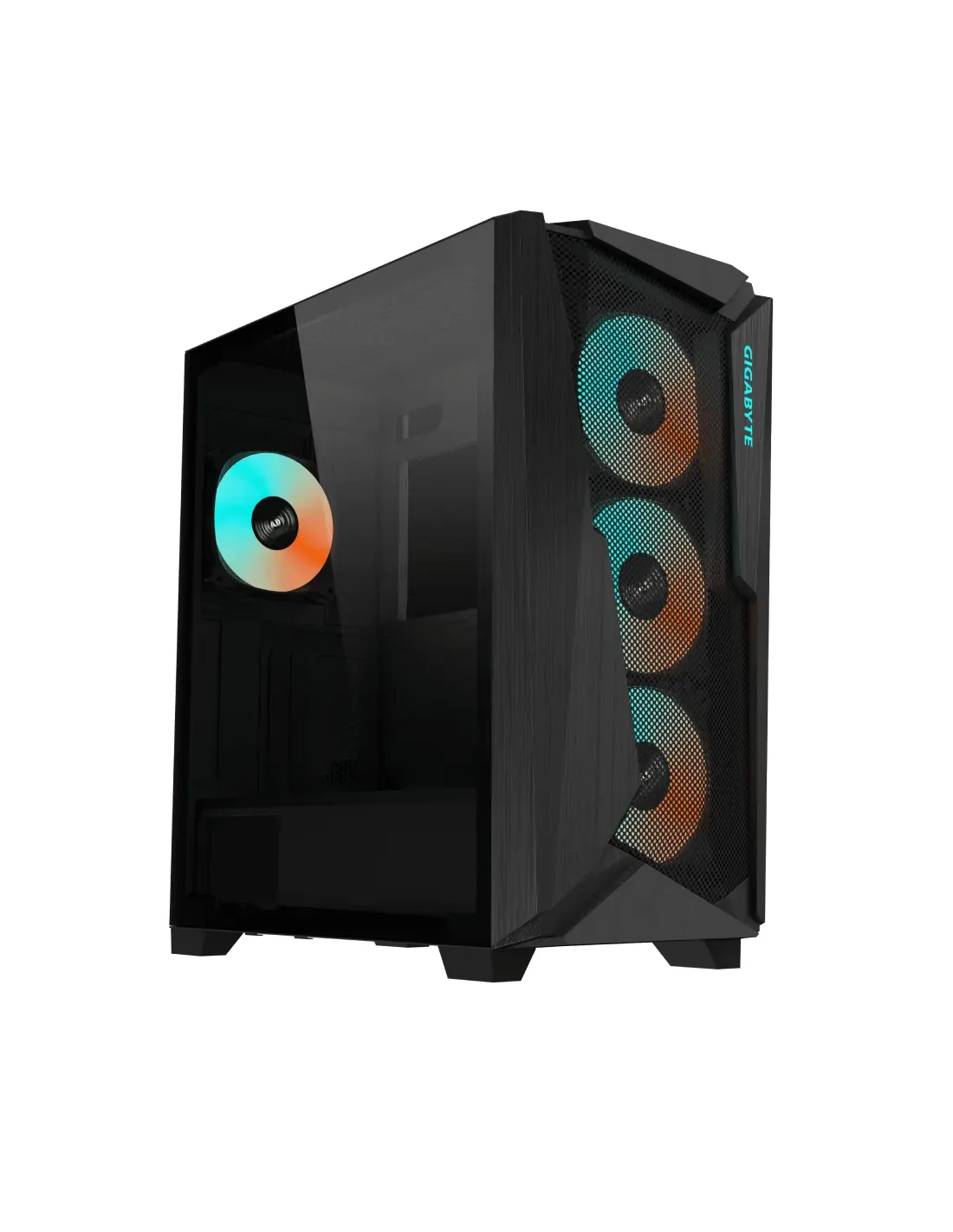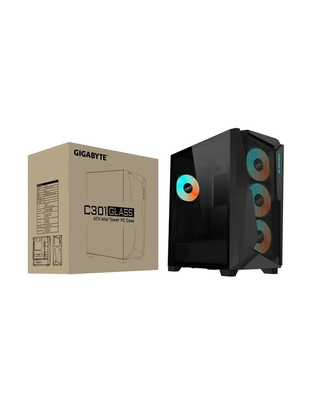 GIGABYTE C301 GLASS. Factor de forma: Midi Tower, Tipo: PC, Color del producto: Negro. Ubicación de fuente de alimentación: Fondo, Factores de forma de la fuente de alimentación compatibles: ATX. Ventiladores frontales instalados: 3x 120 mm, Diámetro de ventiladores frontales soportados: 120,140 mm, Ventiladores traseros instalados: 1x 120 mm. Tamaños de disco duro soportados: 2.5,3.5". Ancho: 282 mm, Profundidad: 530 mm, Altura: 530 mm