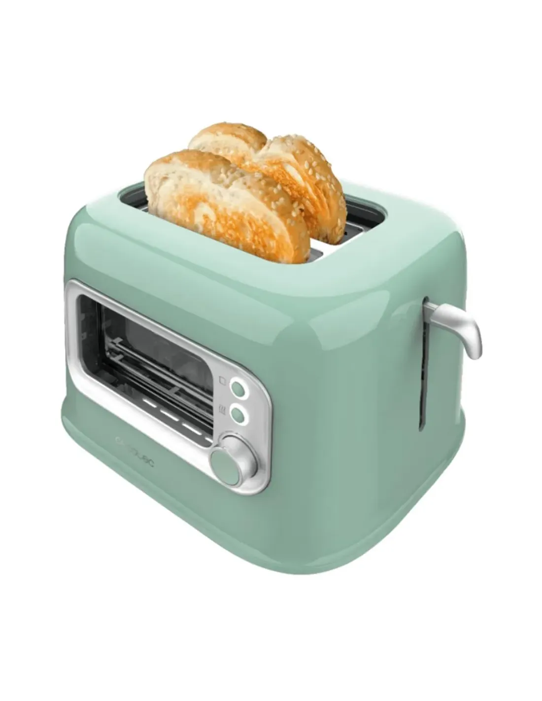 Saborea desayunos completos.Gracias a las dos ranuras extra anchas del tostador podrás introducir panes del grosor que quieras. Disfruta de desayunos completos y deliciosos con sus 700 W de potencia con los que podrás tostar rápidamente tu pan preferido de la mejor manera.No más tostadas quemadas.La tostadora expulsará automáticamente tus tostadas cuando el tiempo haya finalizado y se apagará automáticamente, evitando que tus panes se quemen.Tostado uniforme, tostado perfecto.El sistema de autocentrado tuesta el pan de manera uniforme por ambas caras para que puedas disfrutar de unas tostadas crujientes y perfectas. Elige entre sus 5 posiciones de tostado y consigue resultados a tu gusto.Controla todo el proceso.Gracias a la ventana de visualización de tu tostador vintage, podrás controlar en todo momento tu tostada a la vez que le das un toque diseño a tu hogar con la colección retro más completa.- 2 ranuras extraanchas: introduce panes gruesos o de gran tamaño.- 700 W de potencia: tostadas crujientes rápidamente.- Ventana de visualización: la tostadora dispone de una ventana de visualización de tostado para controlar el proceso.- Diseño retro en verde: dale un toque de diseño vintage a tu tostadora.- Cubierta antipolvo: evita que la suciedad entre dentro del producto.- Mecanismo de apagado y pop-up automático: elevación de la tostada de forma automática al inicio y fin del programa.- Sistema de autocentrado: consigue un tostado uniforme por las dos caras.- Potencia regulable: 5 posiciones de tostado para un resultado al gusto.