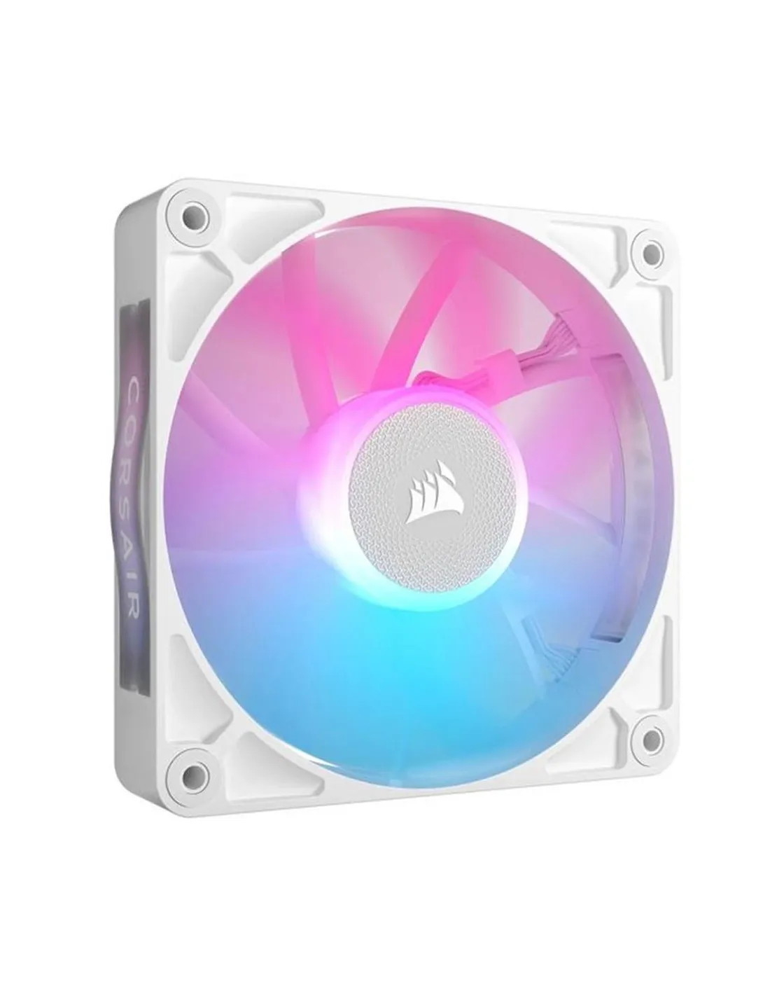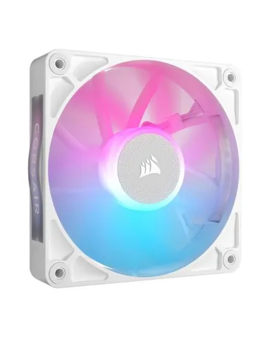 El ventilador incluye **iluminación LED RGB multicolor**, compatible con el ecosistema **Corsair iCUE LINK**, lo que permite sincronizar efectos con otros dispositivos Corsair. Su diseño en color blanco encaja perfectamente en configuraciones modernas con chasis de estilo limpio o minimalista.