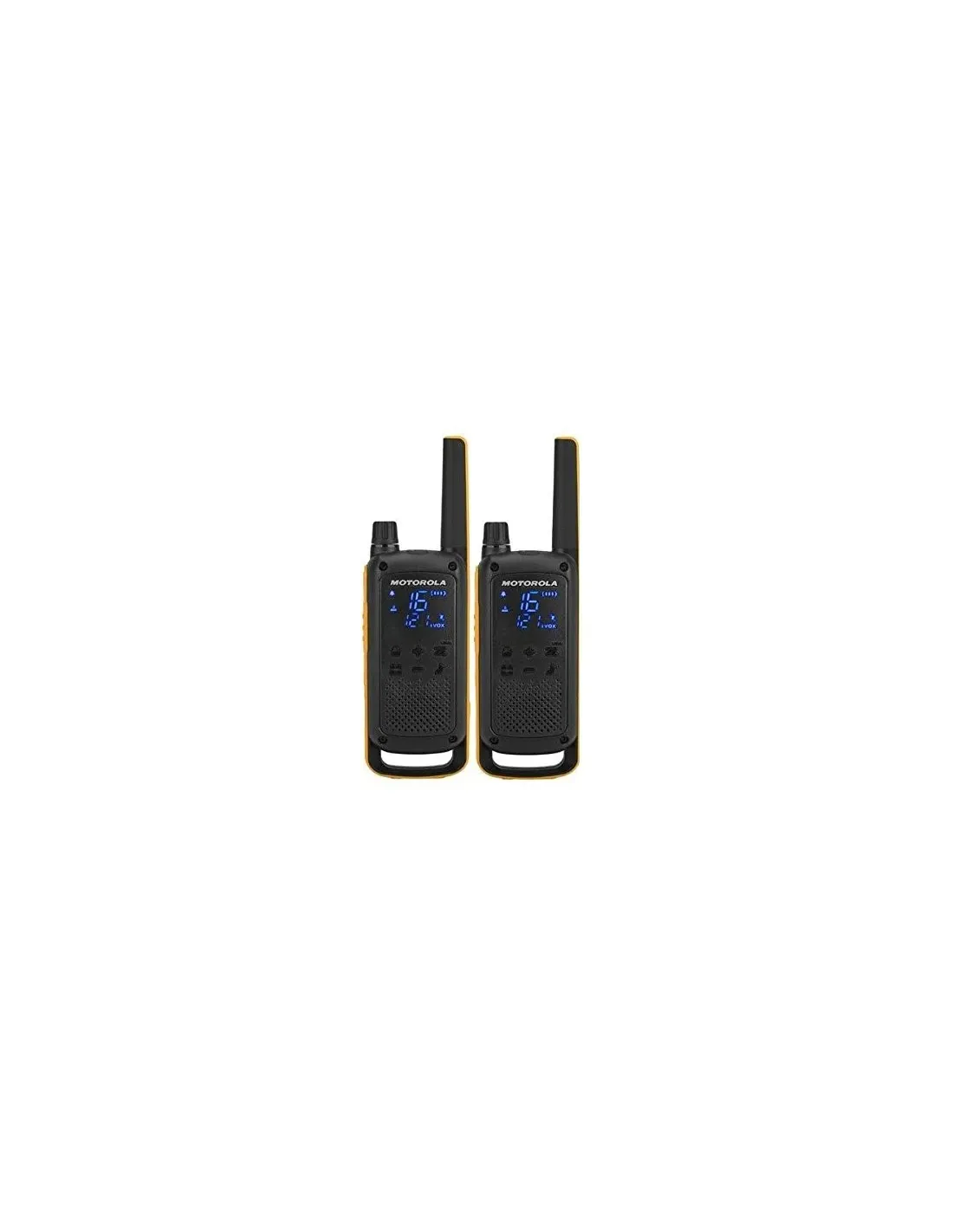 Walkie Talkie Motorola T82 Extreme Pack. Alcance: hasta 10 km. Autonomía de hasta 18 horas. Pantalla LCD oculta con indicador de batería e iluminación trasera. Canales: 16 + 121 códigos de seguridad, Ancho de banda: 12,5 Khz. Resistente al mal tiempo IPx4. Baterías, cargador. Microauriculares y clip de transporte incluidos. Conector para cascos de 2,5mm y conector de carga Micro USB. Incluye adhesivos de personalización y estuche protector de transporte.