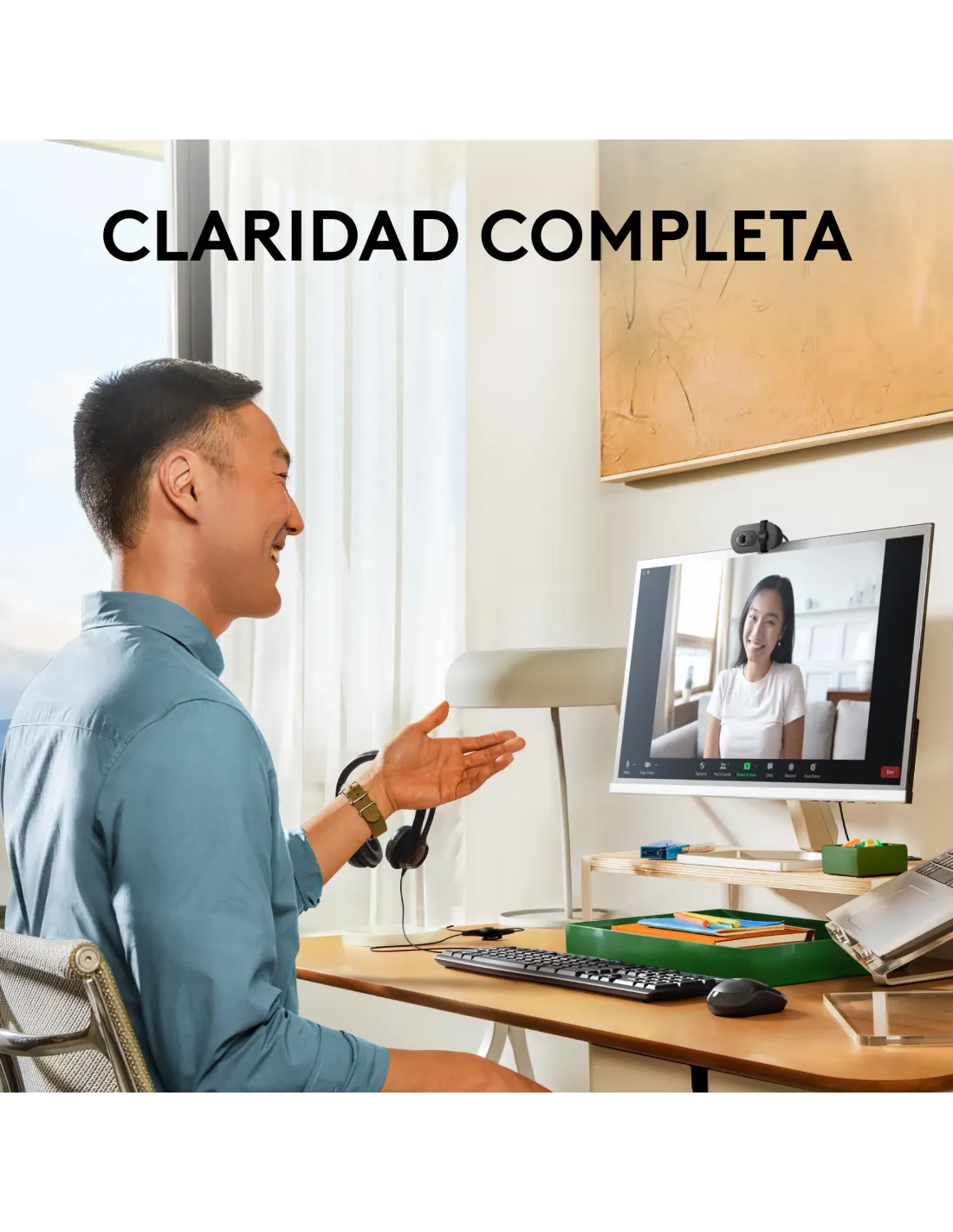 DimensionesAltura: 31,91 mmAnchura: 72,91 mmProfundidad: 66,64 mmPeso: 75 g, solo cámara (sin incluir peso del cable)Longitud del cable fijo: 1,5 mEspecificaciones técnicasMúltiples resoluciones1080p/30 fps (1920 x 1080 píxeles)720p/30 fps (1280 x 720 píxeles)Megapíxeles de cámara: 2 MPTipo de enfoque: foco fijoTipo de lente: lente especial de plástico de 4 elementos con revestimiento antirreflectante(Se requieren al menos 2 GB de RAM para streaming de vídeo 1080p y suele hacer falta 1 GB para streaming 720p)Tipo de micrófono integradoMicrófono omnidireccionalRadio de acción del micrófono: hasta 1 mCampo visual diagonal (dFoV): 58Tapa de privacidad integradaConectividad USB: USB plug and playCorrección de iluminación automática RightLight 2 para luces difícilesSostenibilidadPlástico en grafito: 77 % de material reciclado posconsumo 1Excluye componentes electrónicos (EE), cables y embalaje.Plástico en blanco crudo y rosado: 34 % de material reciclado posconsumo 2Excluye componentes electrónicos (EE), cables y embalaje.Embalaje de papel: Certificación para FSCCon certificación de carbono neutro